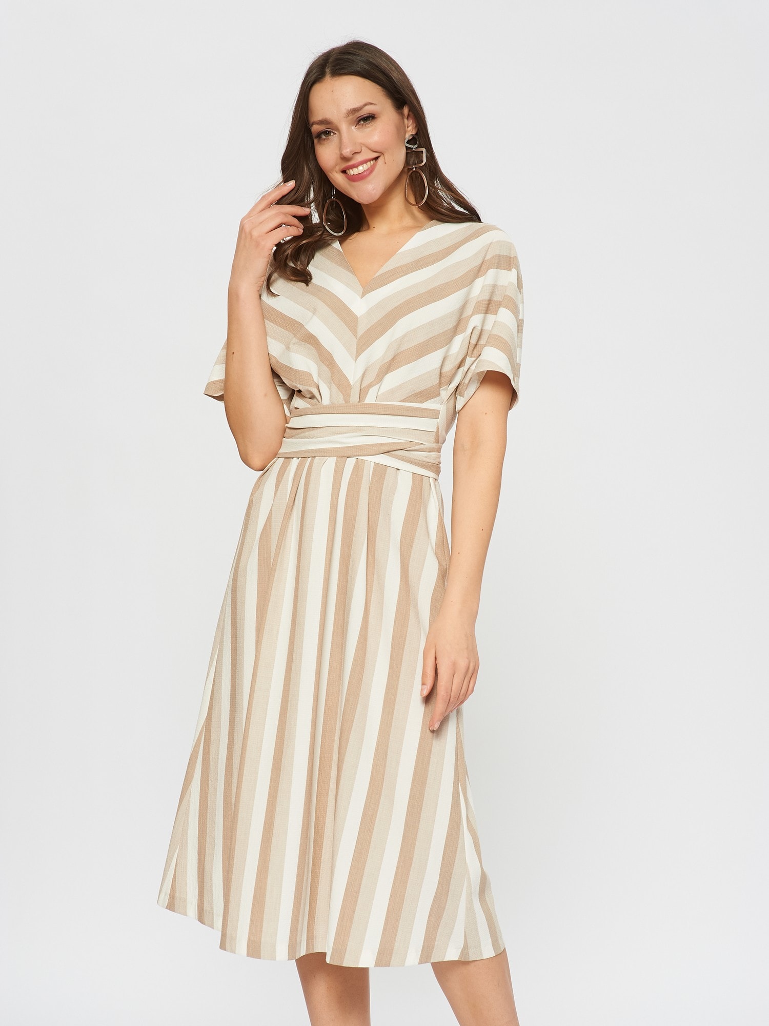 Платье в полоску с V-образным вырезом и цельнокроенным рукавом. Широкий пояс вшит в боковые швы, поэтому смело экспериментируйте с его завязыванием. Это платье идеально и для встречи в городе, и для прогулки по греческим пляжам.