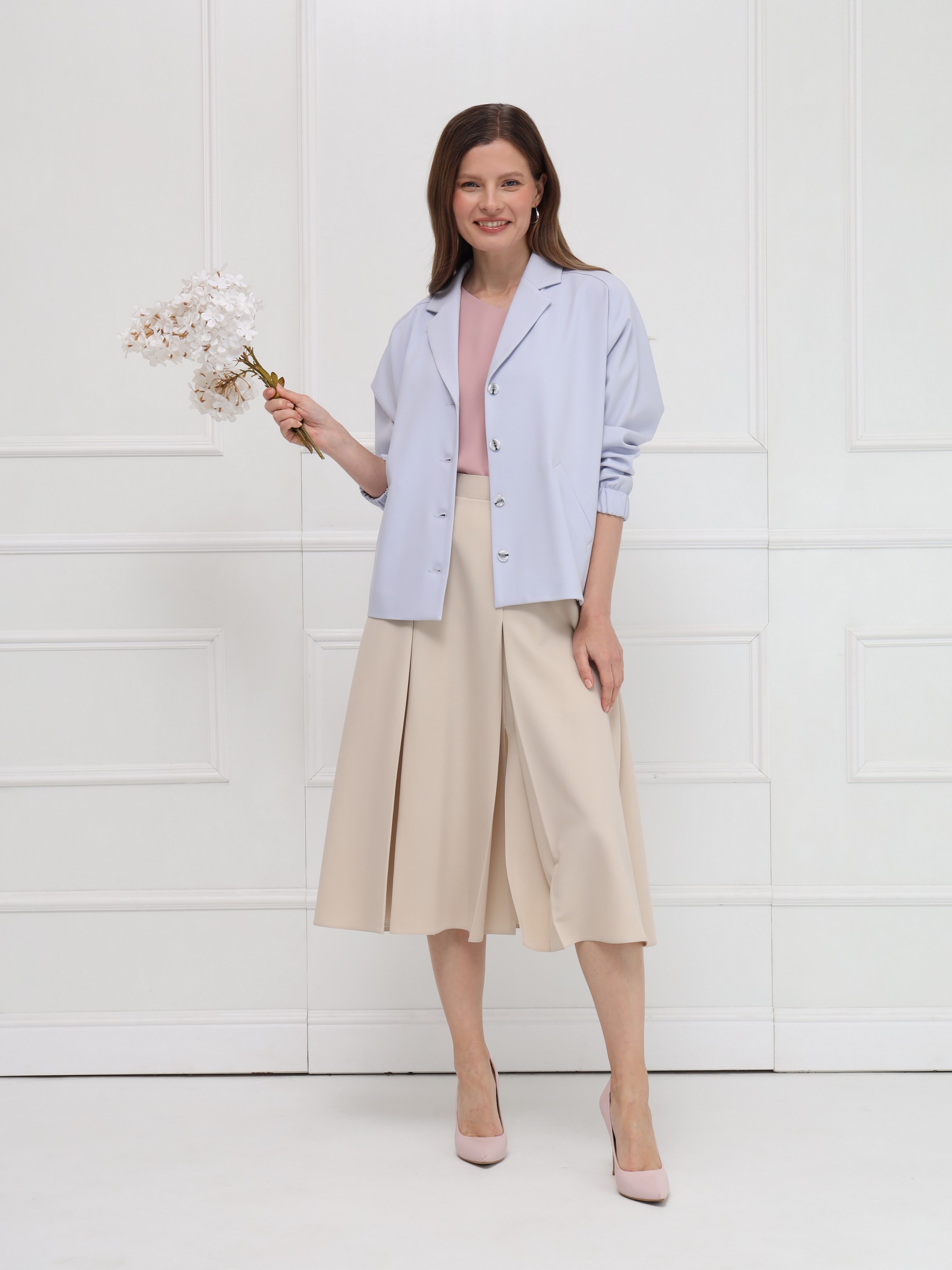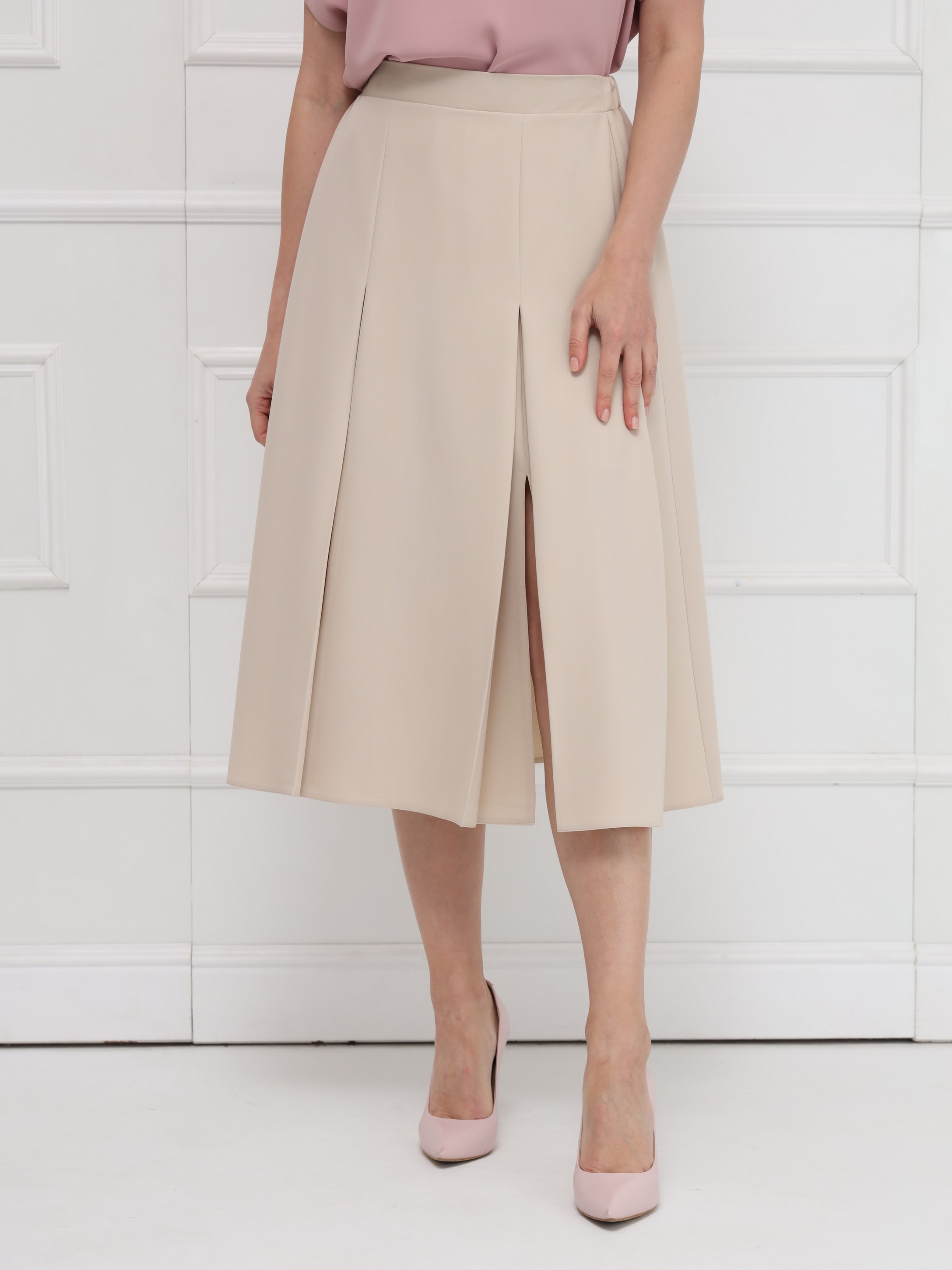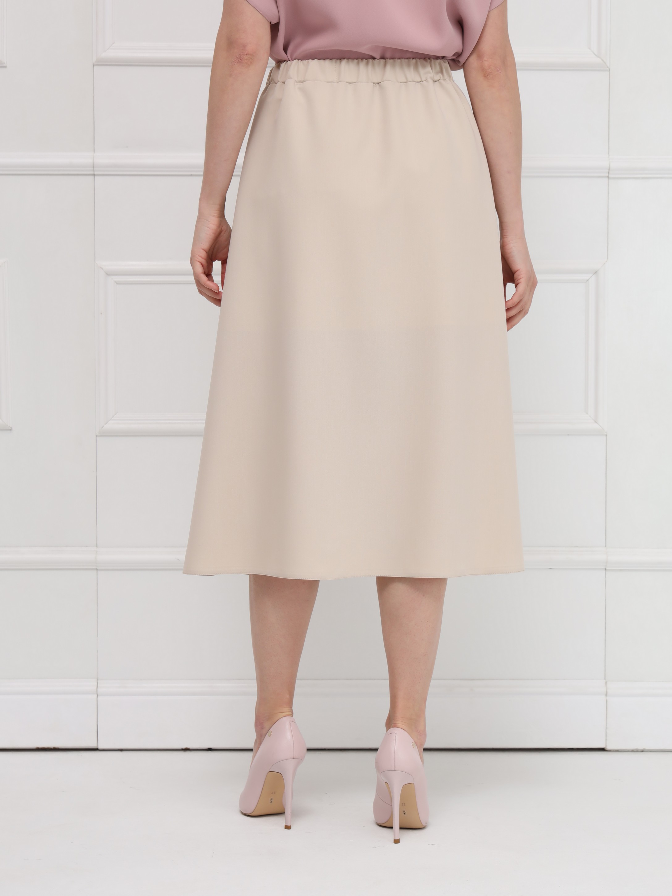 Юбка-миди бежевого оттенка, выполненная в женственном А-силуэте, мягко струится и подчёркивает фигуру. Спереди от бедра заложены изящные складки, создающие лёгкое движение ткани. Внутри левой складки скрыт аккуратный разрез, который при ходьбе ненавязчиво приоткрывает ногу, добавляя образу утончённой динамики. Пояс сзади на резинке. Юбка дополнена подкладкой, благодаря чему комфортна в носке и прекрасно держит форму, оставаясь лёгкой и элегантной одновременно. На фото юбка представлена с жакетом В-501 ЛАС(В6) и блузкой Д-2055 РОА(В6).