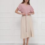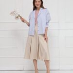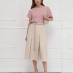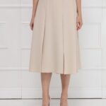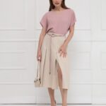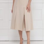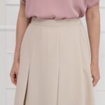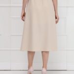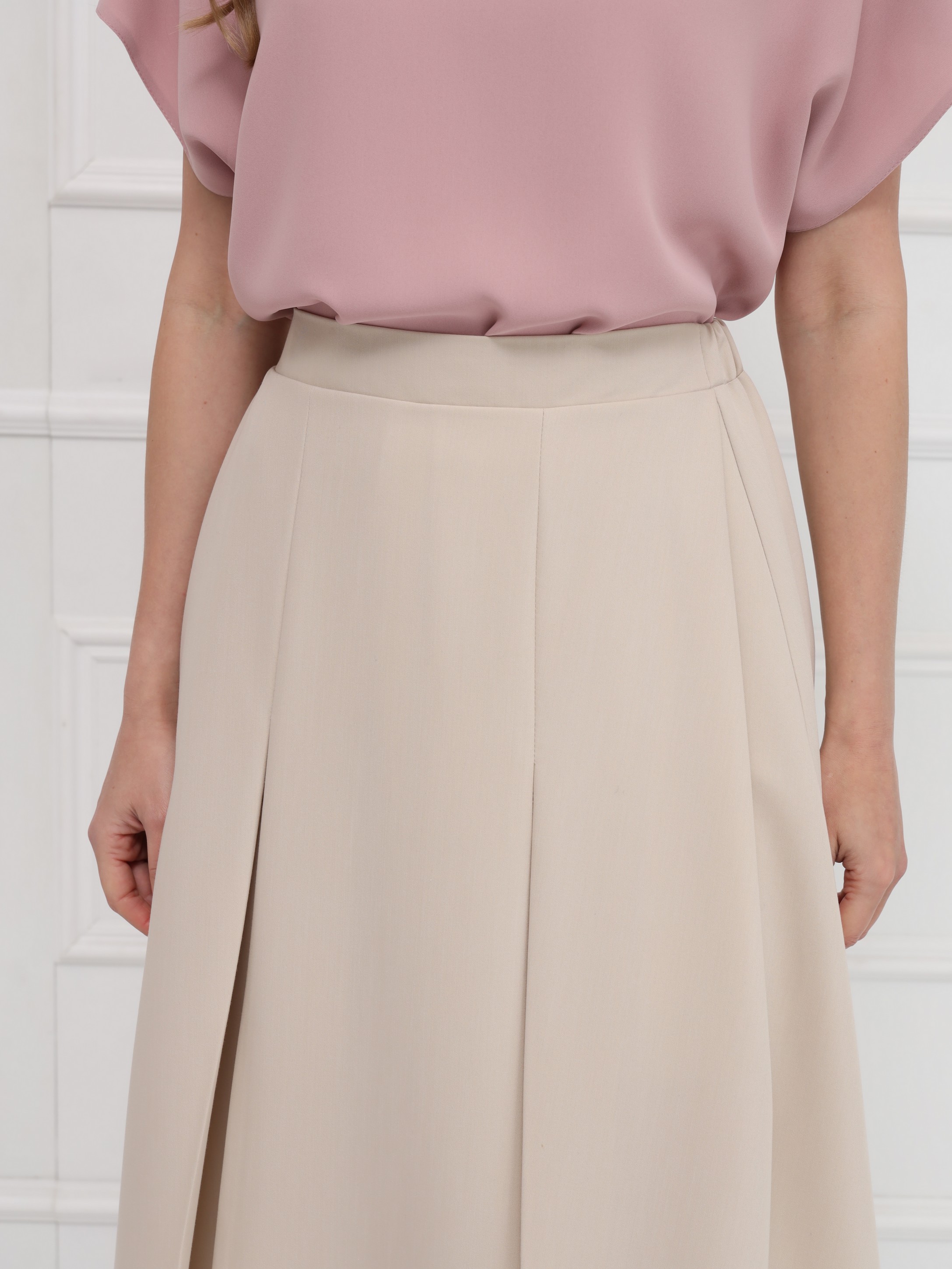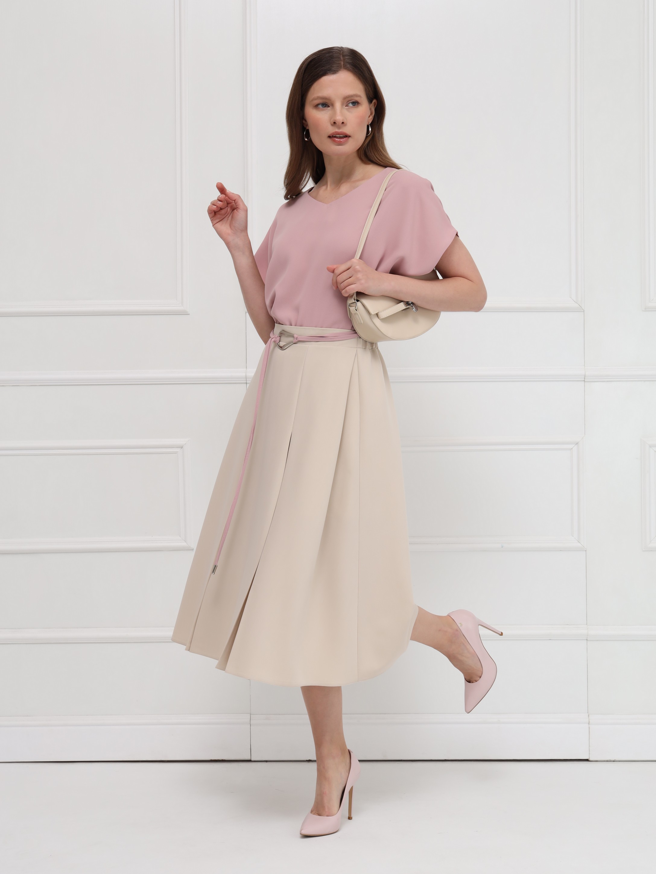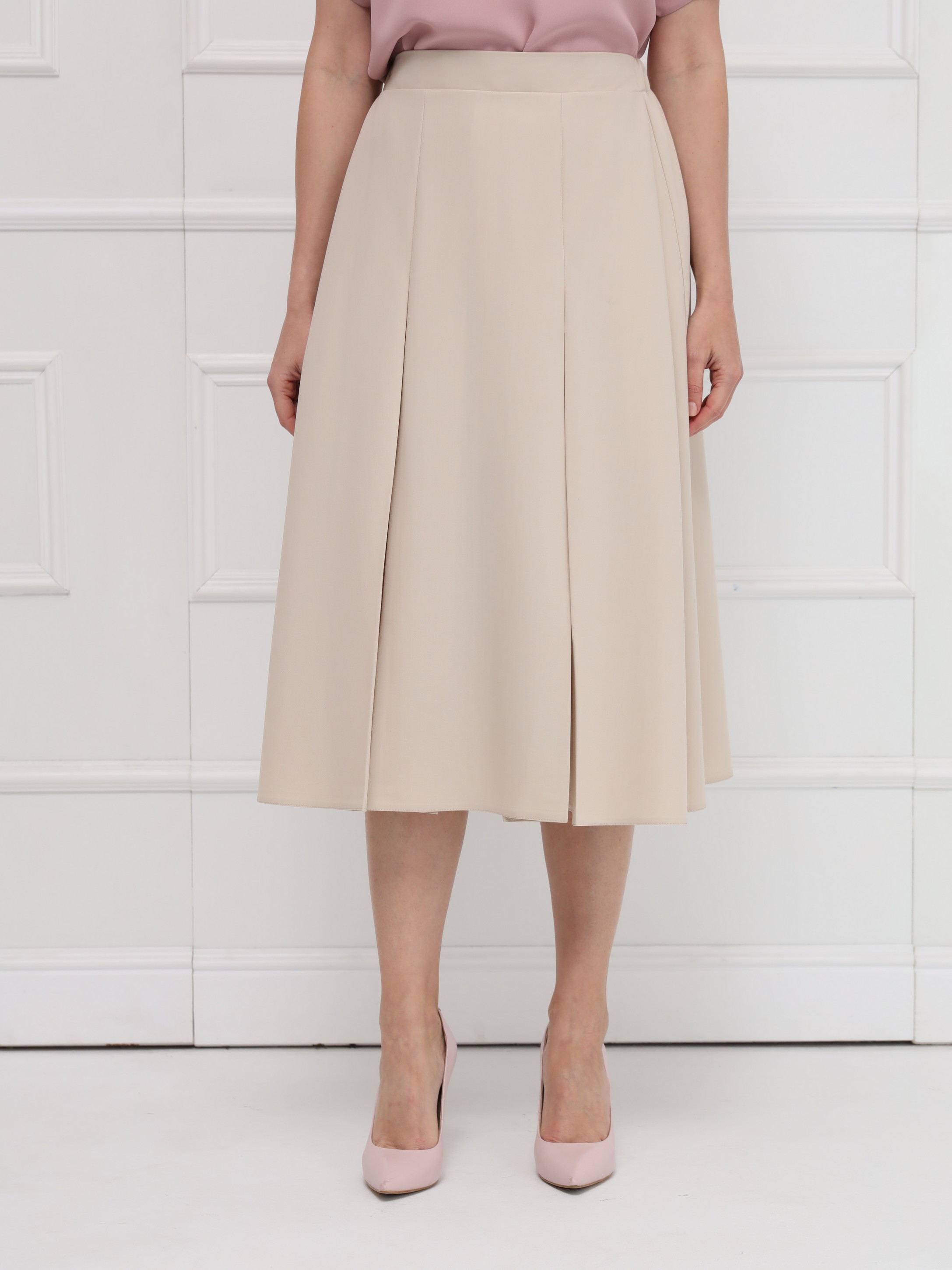 Юбка-миди бежевого оттенка, выполненная в женственном А-силуэте, мягко струится и подчёркивает фигуру. Спереди от бедра заложены изящные складки, создающие лёгкое движение ткани. Внутри левой складки скрыт аккуратный разрез, который при ходьбе ненавязчиво приоткрывает ногу, добавляя образу утончённой динамики. Пояс сзади на резинке. Юбка дополнена подкладкой, благодаря чему комфортна в носке и прекрасно держит форму, оставаясь лёгкой и элегантной одновременно. На фото юбка представлена с жакетом В-501 ЛАС(В6) и блузкой Д-2055 РОА(В6).