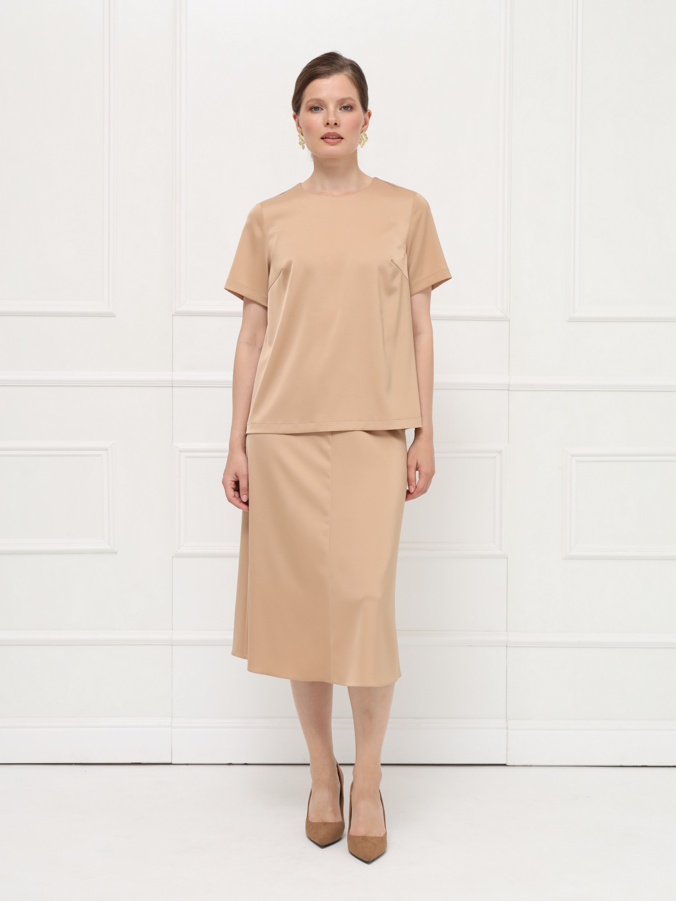 Изысканная юбка миди из атласа карамельного оттенка, мягко облегает талию и бёдра благодаря крою из четырёх клиньев, а затем струится вниз лёгким расклешением. Плотная внутренняя резинка обеспечивает безупречную посадку, а потайная молния на спинке сохраняет чистоту линий. Лёгкая подкладка с эластаном делает юбку комфортной и подвижной, позволяя ткани красиво играть при каждом шаге. На фото юбка представлена с блузкой Д-810 КСР(О5).