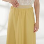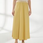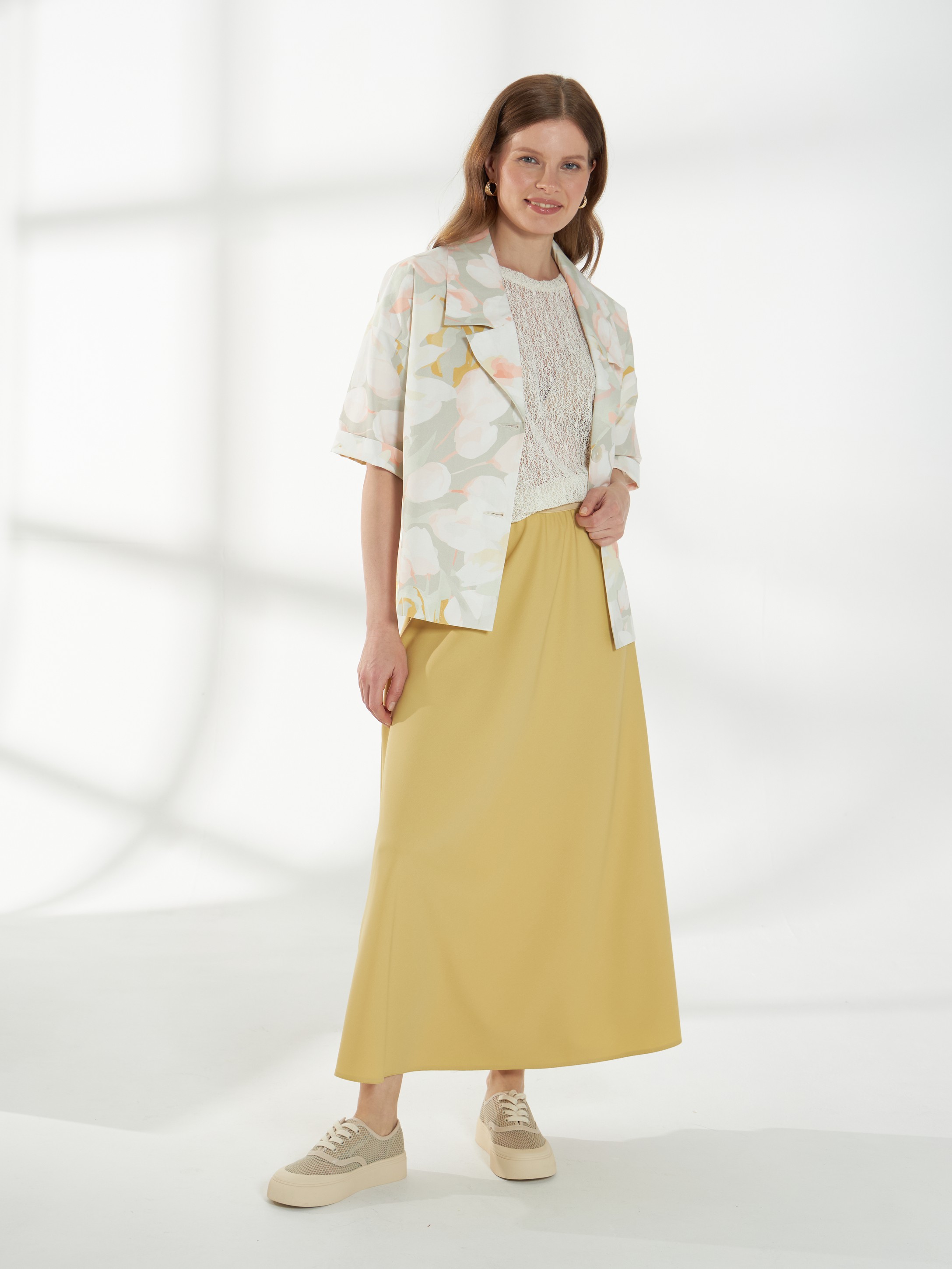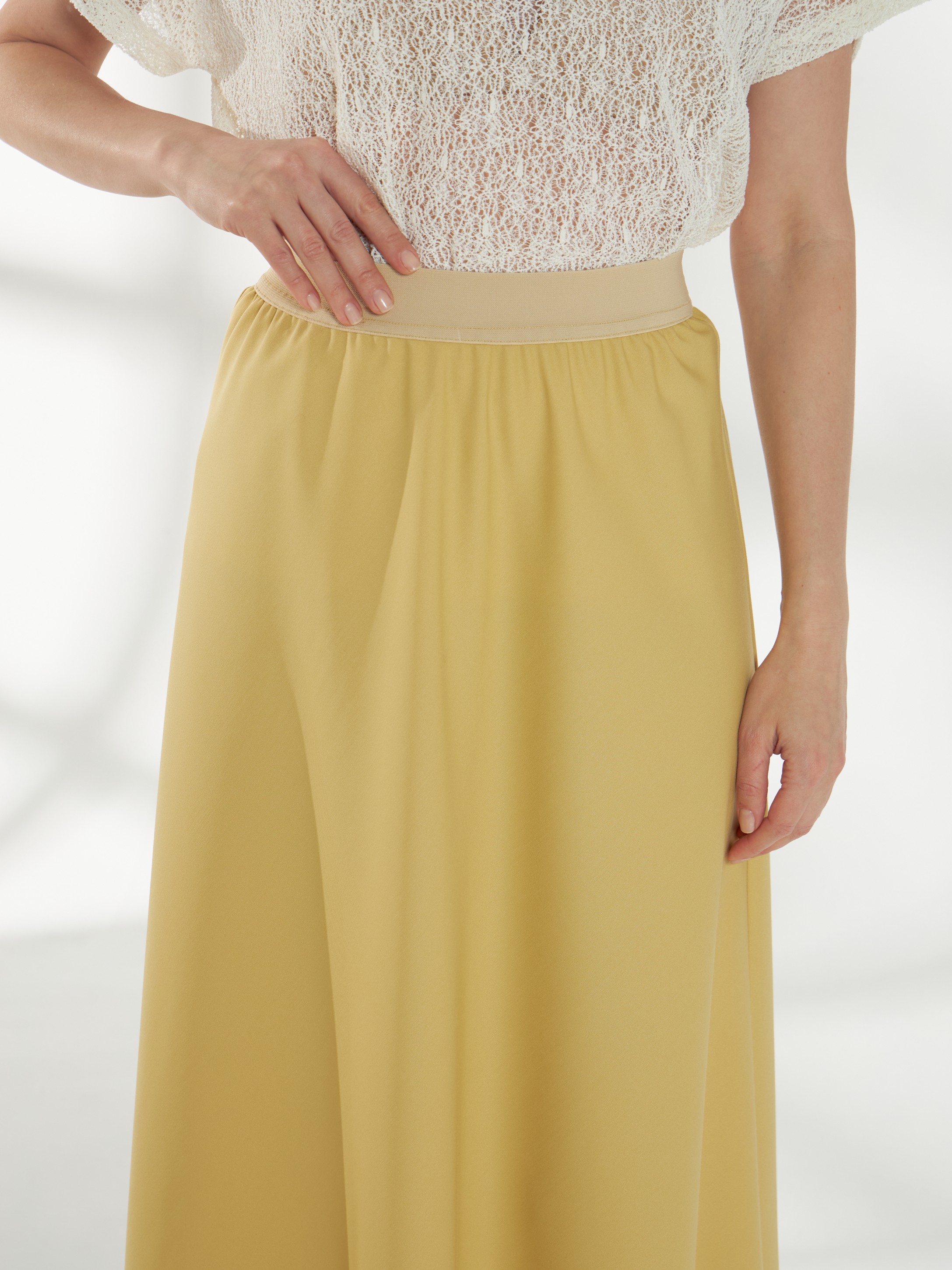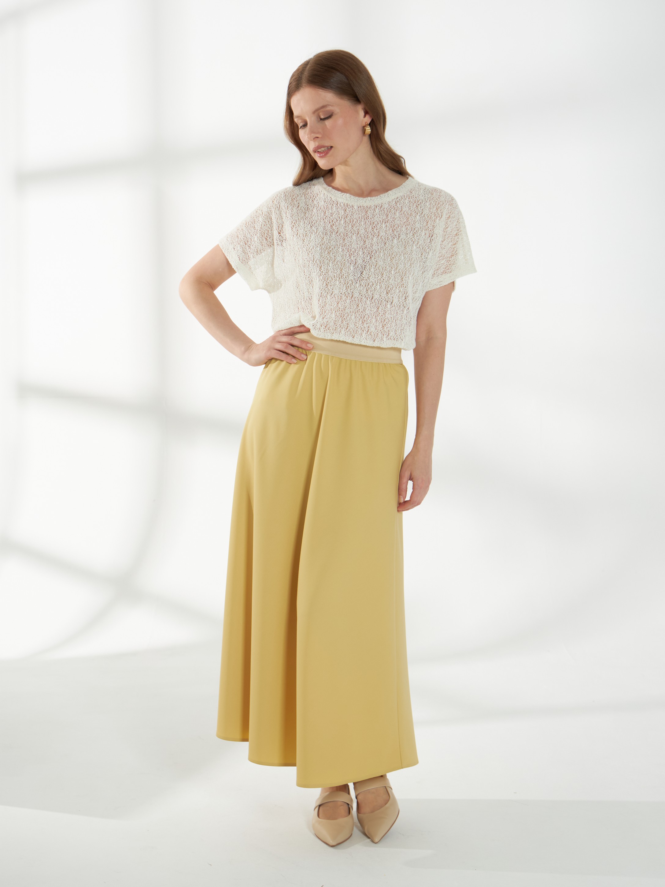 Юбка миди трапециевидного кроя, в светлом горчичном оттенке, слегка расширяющаяся к низу. Пояс-резинка обеспечивает комфортную посадку, а свободный силуэт создаёт лёгкий и непринуждённый образ. На фото юбка представлена с жакетом В-993 ПАО(В6) и джемпером С-34 НТР(В6).