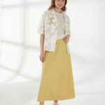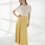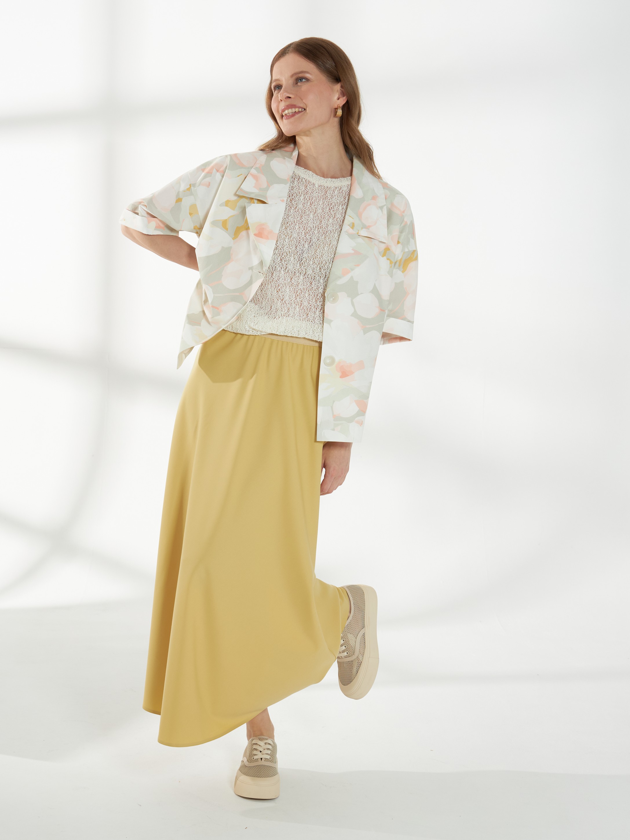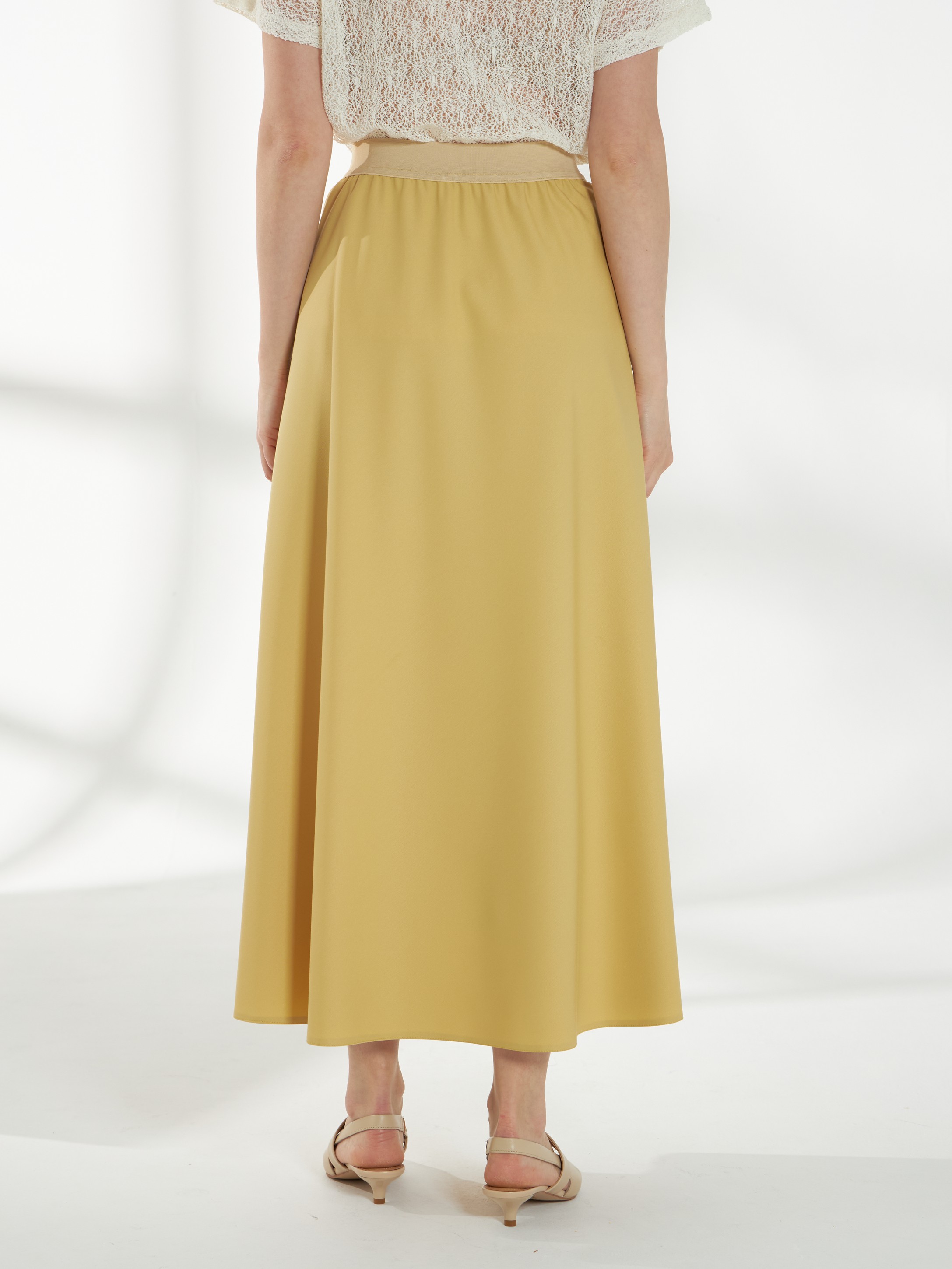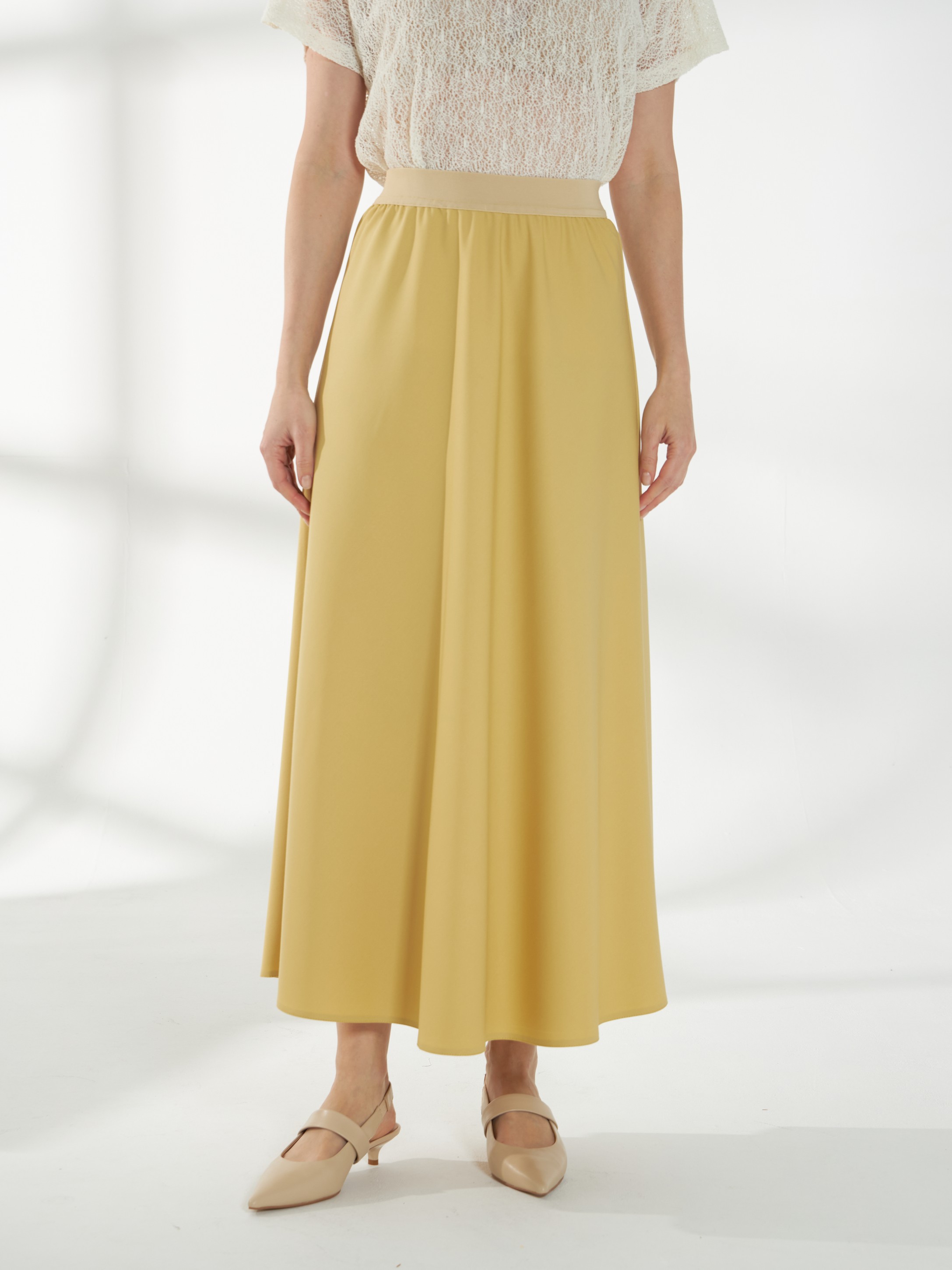 Юбка миди трапециевидного кроя, в светлом горчичном оттенке, слегка расширяющаяся к низу. Пояс-резинка обеспечивает комфортную посадку, а свободный силуэт создаёт лёгкий и непринуждённый образ. На фото юбка представлена с жакетом В-993 ПАО(В6) и джемпером С-34 НТР(В6).