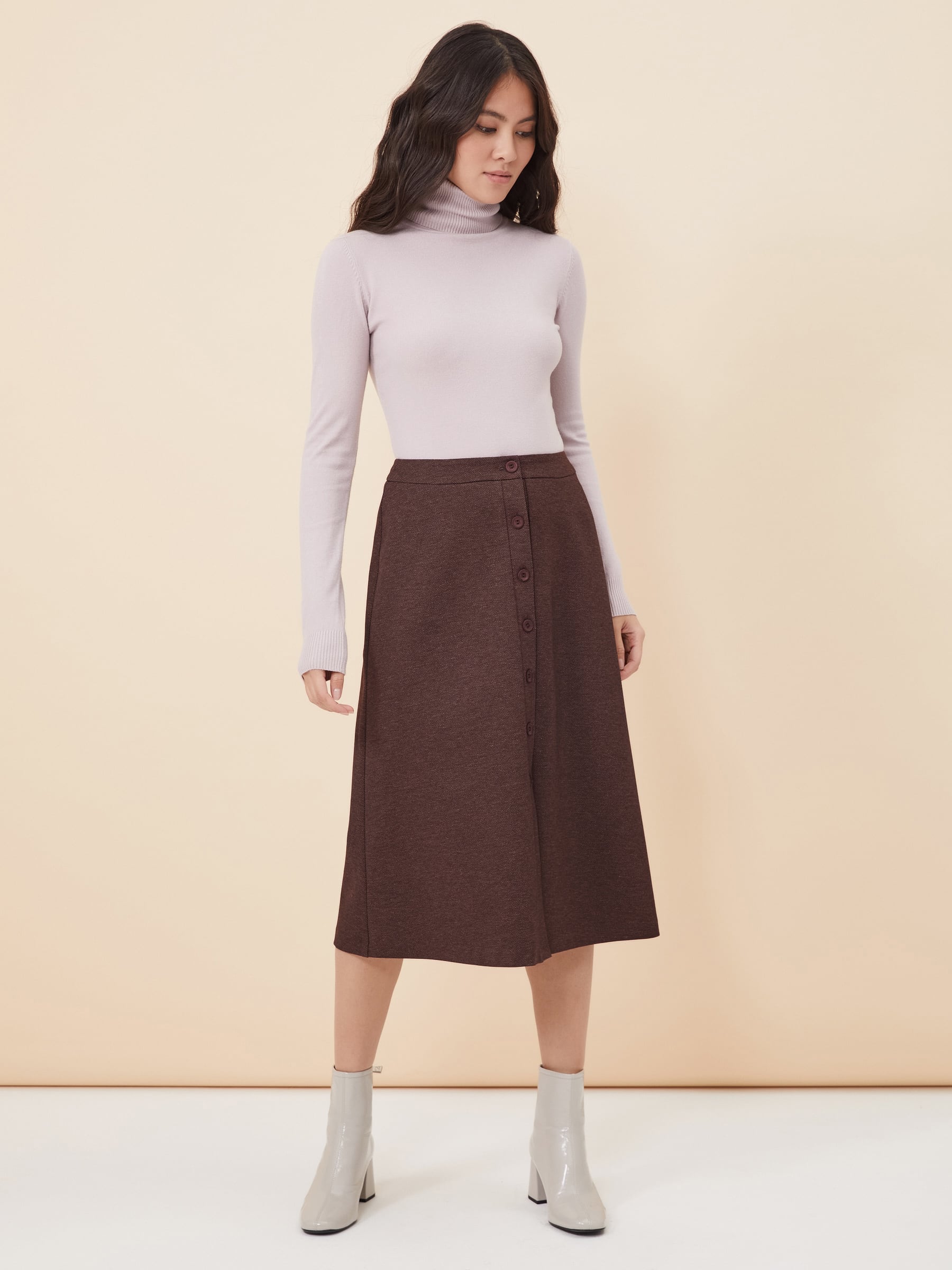 Юбка трапеция на пуговицах спереди , из трикотажного полотна, коричневого цвета.
