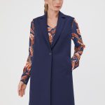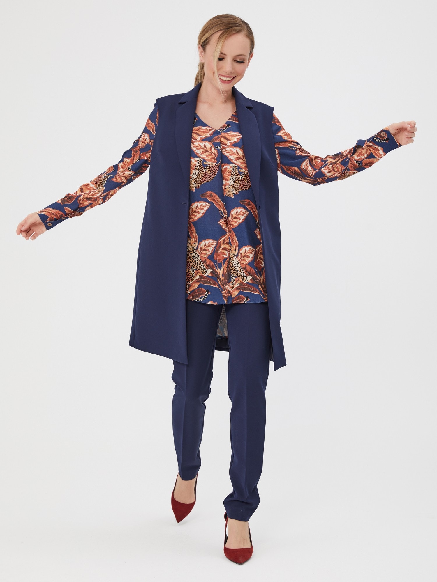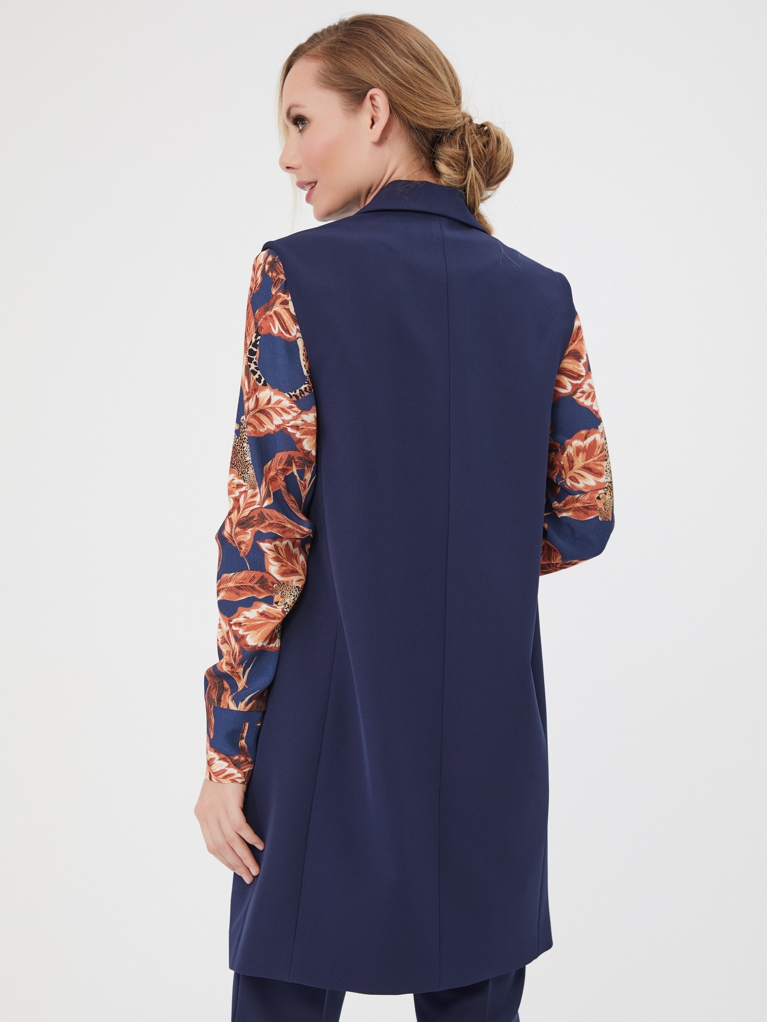Длинный темно-синий жилет на одну пуговицу. Классический английский воротник, карманы в боковых швах. Дополните образ блузкой Д-923 Т(В20) и брюками Б-117 КБ(О)