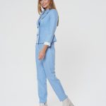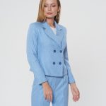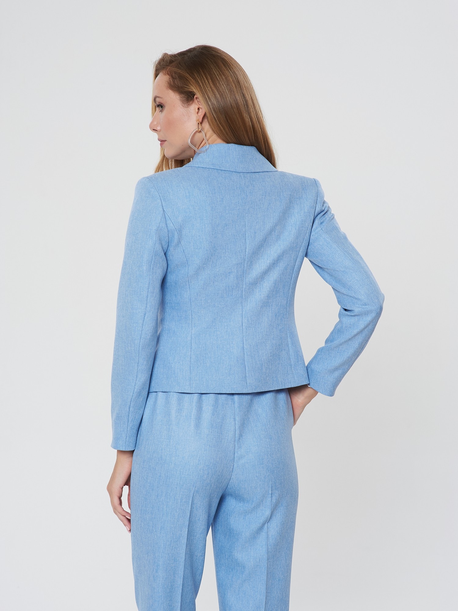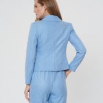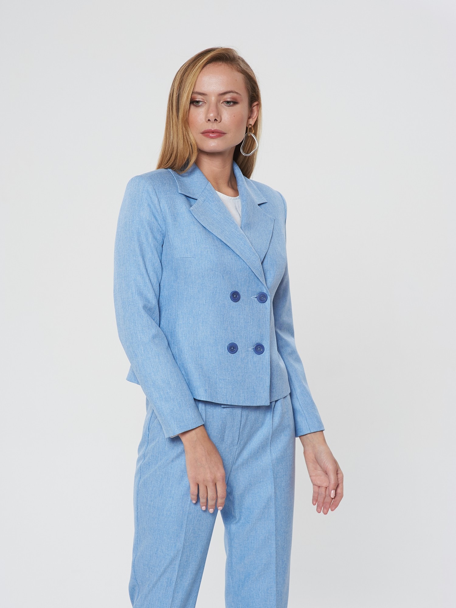 Двубортный укороченный жакет лазурного цвета. Прилегающий силуэт. Дополните образ брюками Б-802 ДЕН(В20) и блузкой Д-810 ПЛ(В20)