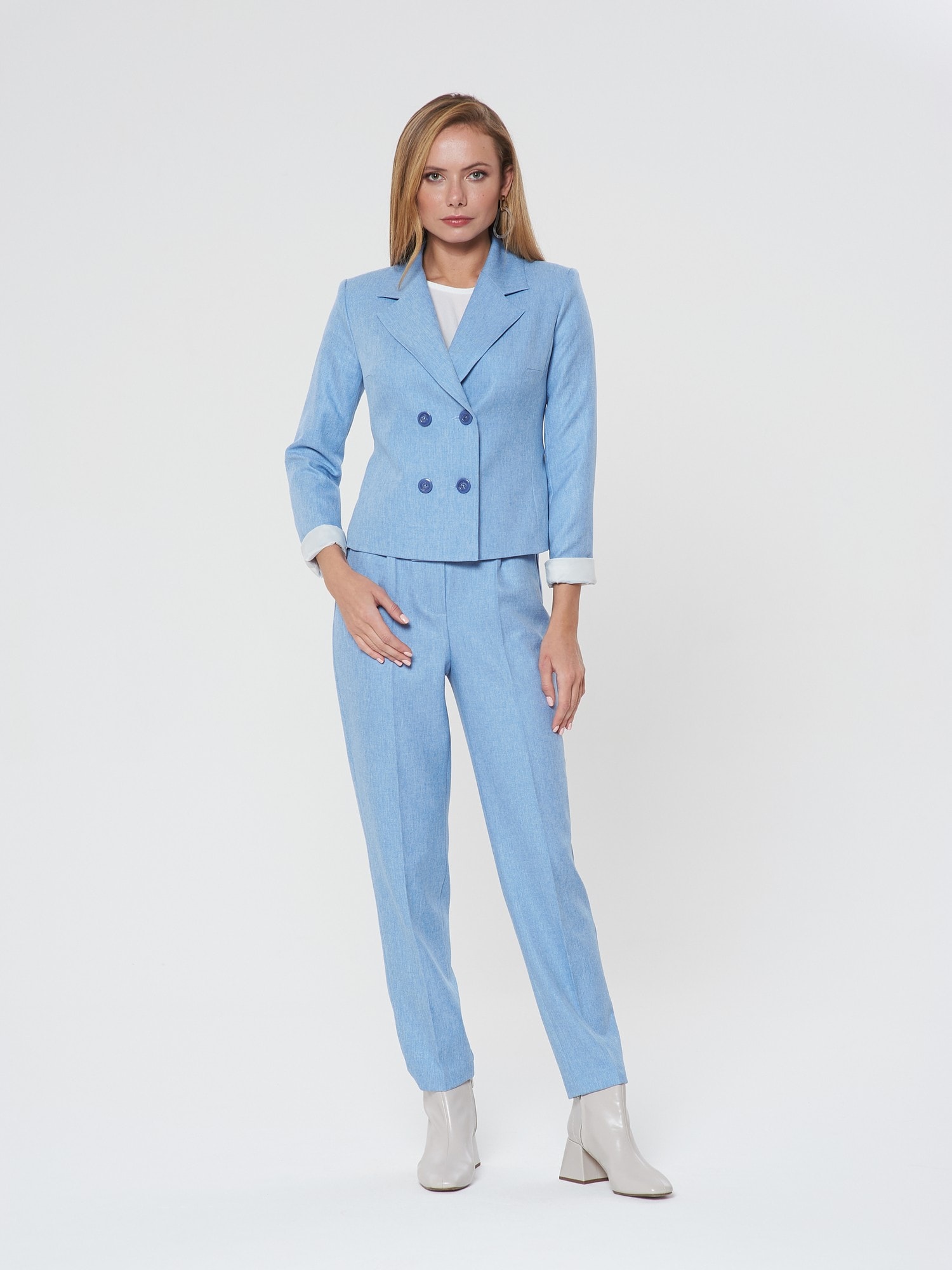 Двубортный укороченный жакет лазурного цвета. Прилегающий силуэт. Дополните образ брюками Б-802 ДЕН(В20) и блузкой Д-810 ПЛ(В20)