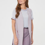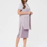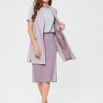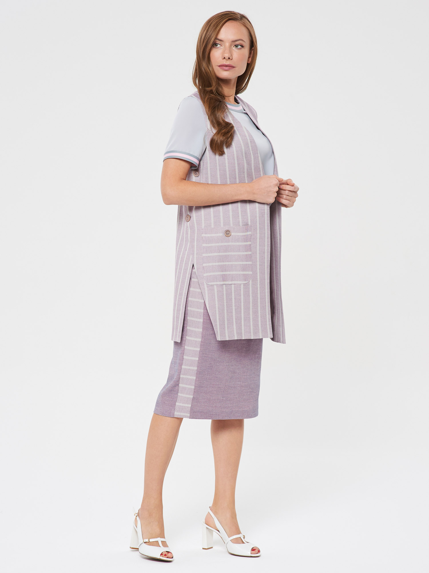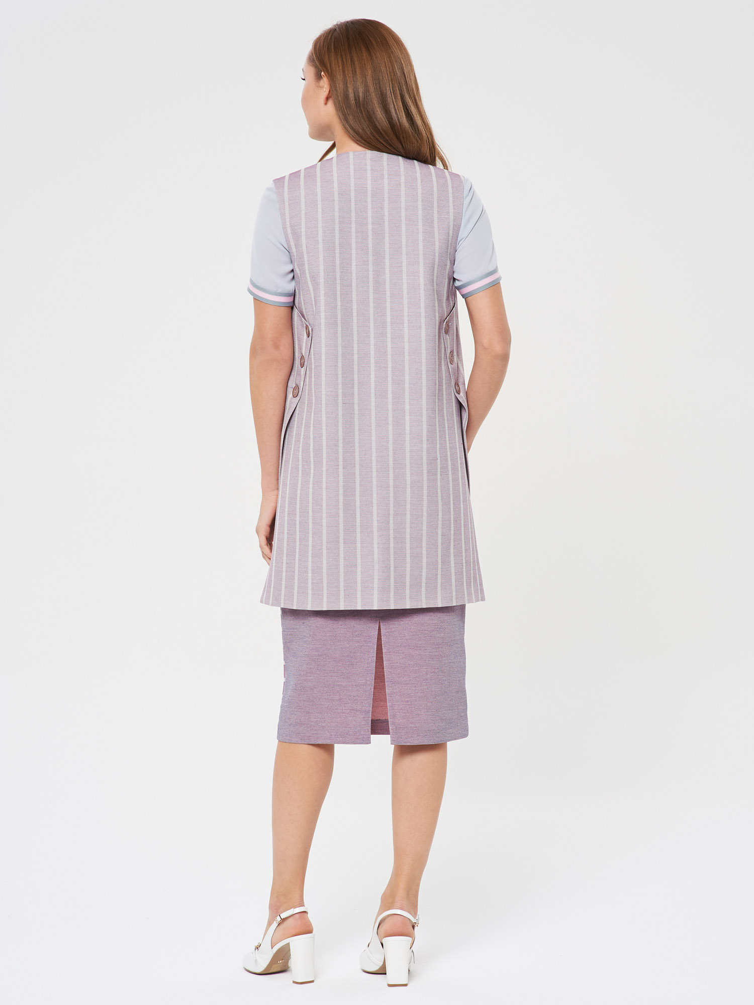 50% вискоза, 23% хлопок, 25% полиэстер, 2% эластан. Размеры 44-52. Жилет свободного кроя без застежки. Модель выполнена из холодно-розового оттенка ткани с добавлением хлопка. На жилете расположены накладные карманы с пуговицами. Для полноценного комплекта дополнен блузкой Д-810 МД2(В9) и юбкой А-902 ЛАКИ(В9) с лампасами из аналогичной ткани.