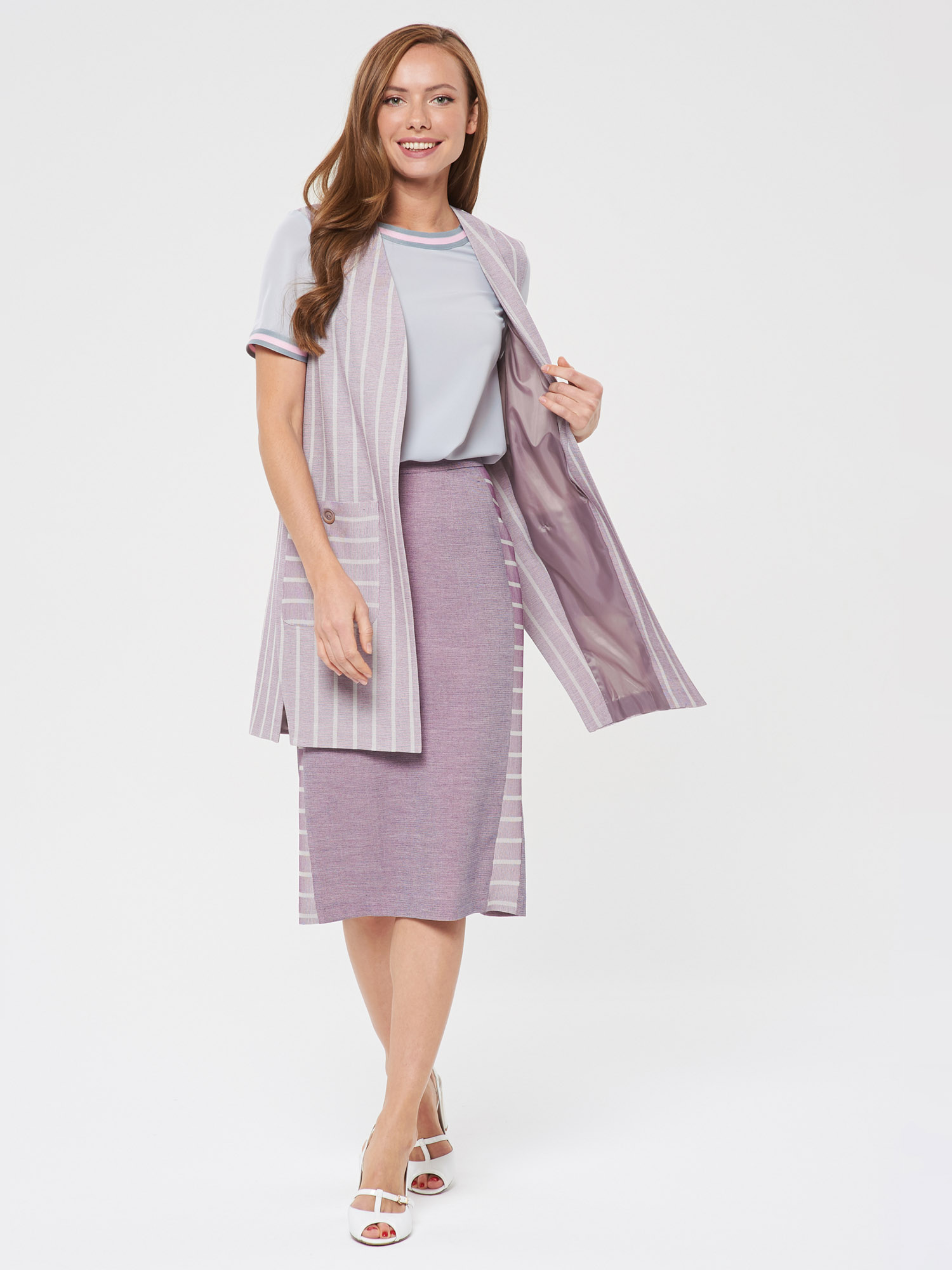 50% вискоза, 23% хлопок, 25% полиэстер, 2% эластан. Размеры 44-52. Жилет свободного кроя без застежки. Модель выполнена из холодно-розового оттенка ткани с добавлением хлопка. На жилете расположены накладные карманы с пуговицами. Для полноценного комплекта дополнен блузкой Д-810 МД2(В9) и юбкой А-902 ЛАКИ(В9) с лампасами из аналогичной ткани.