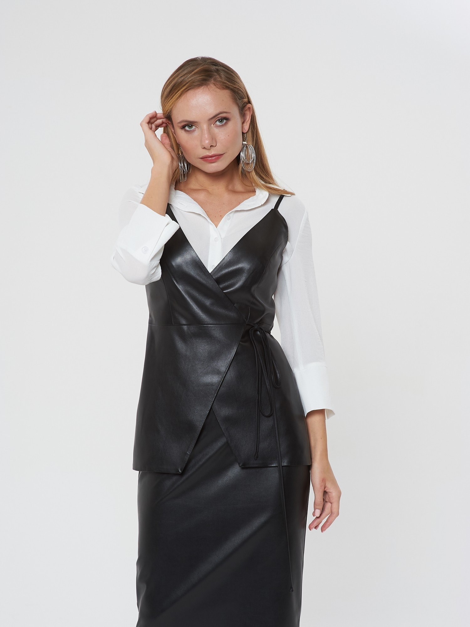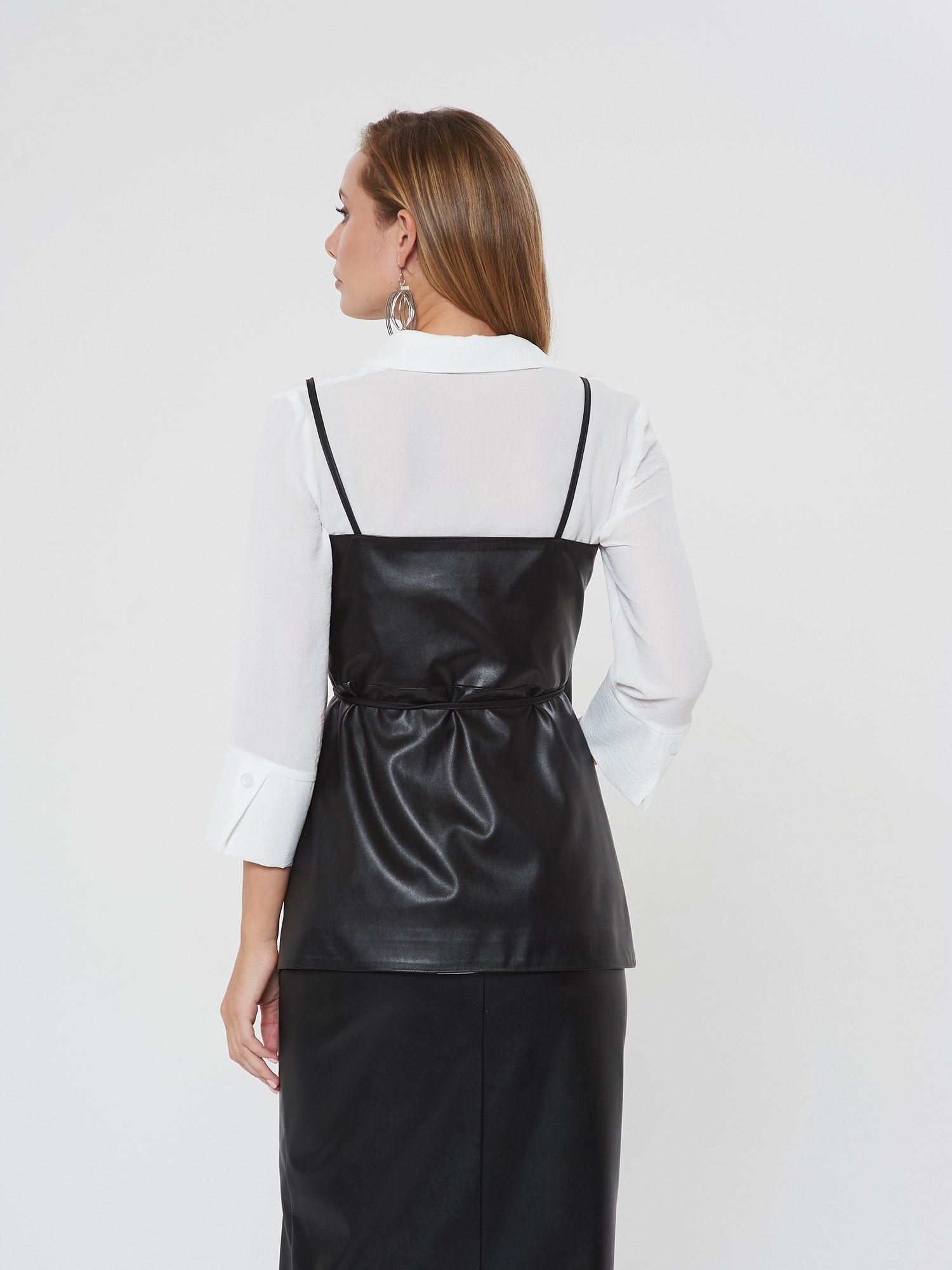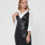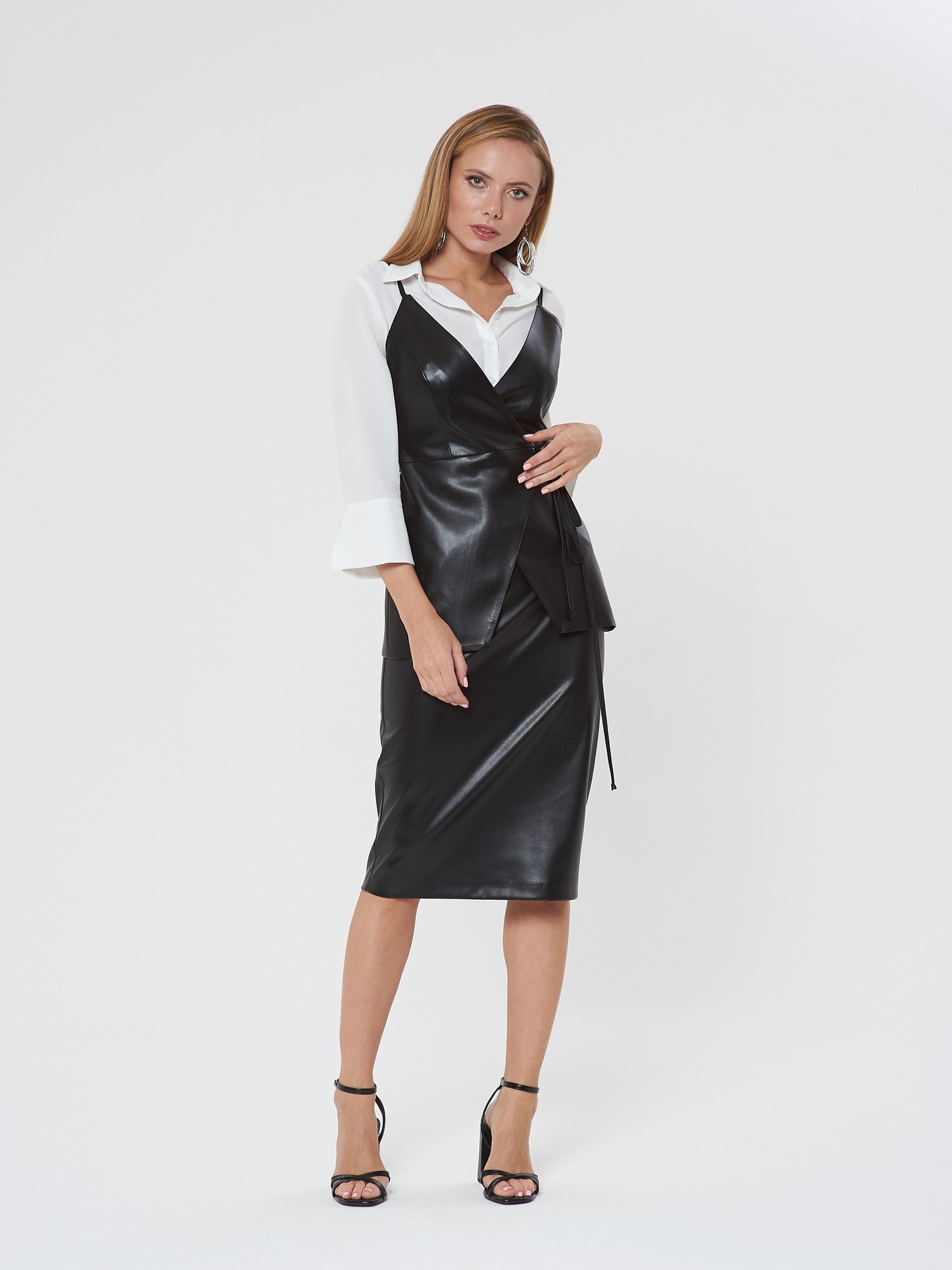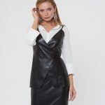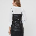 Жакет с запахом на тонких лямках. Утонченный силуэт с завязками на талии. Выполнен изчерной эко-кожи. Сочетайте с блузкой Д-933 ПЛ(В20) и юбкой А-805 ЭК1(В20)