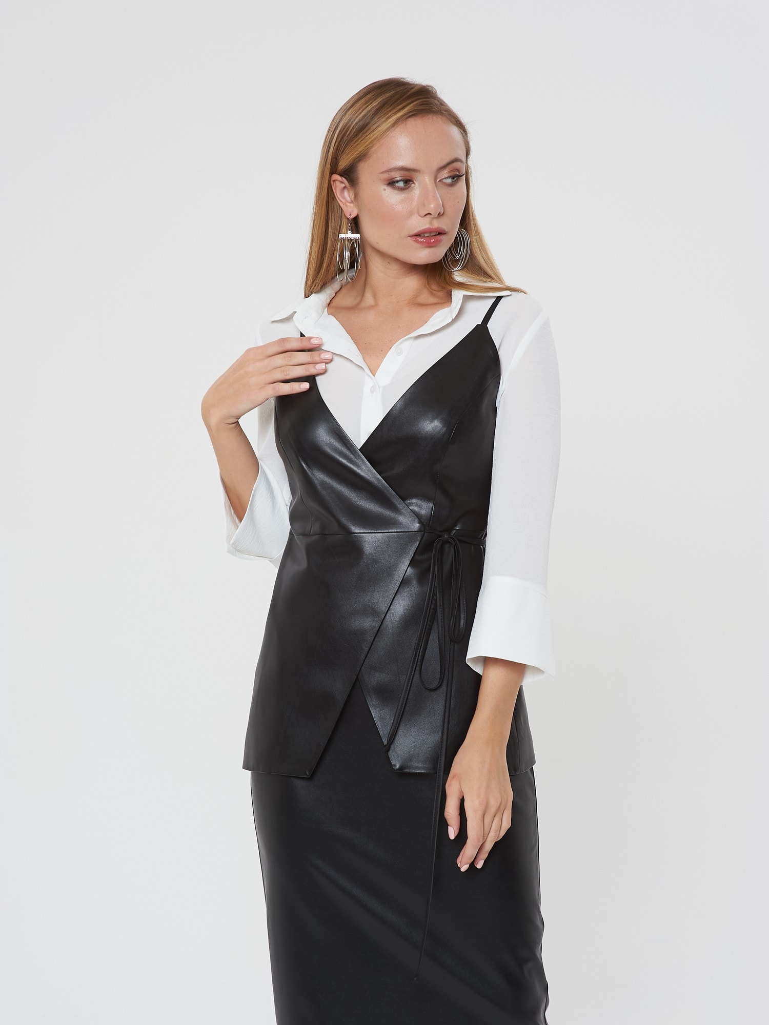 Жакет с запахом на тонких лямках. Утонченный силуэт с завязками на талии. Выполнен изчерной эко-кожи. Сочетайте с блузкой Д-933 ПЛ(В20) и юбкой А-805 ЭК1(В20)