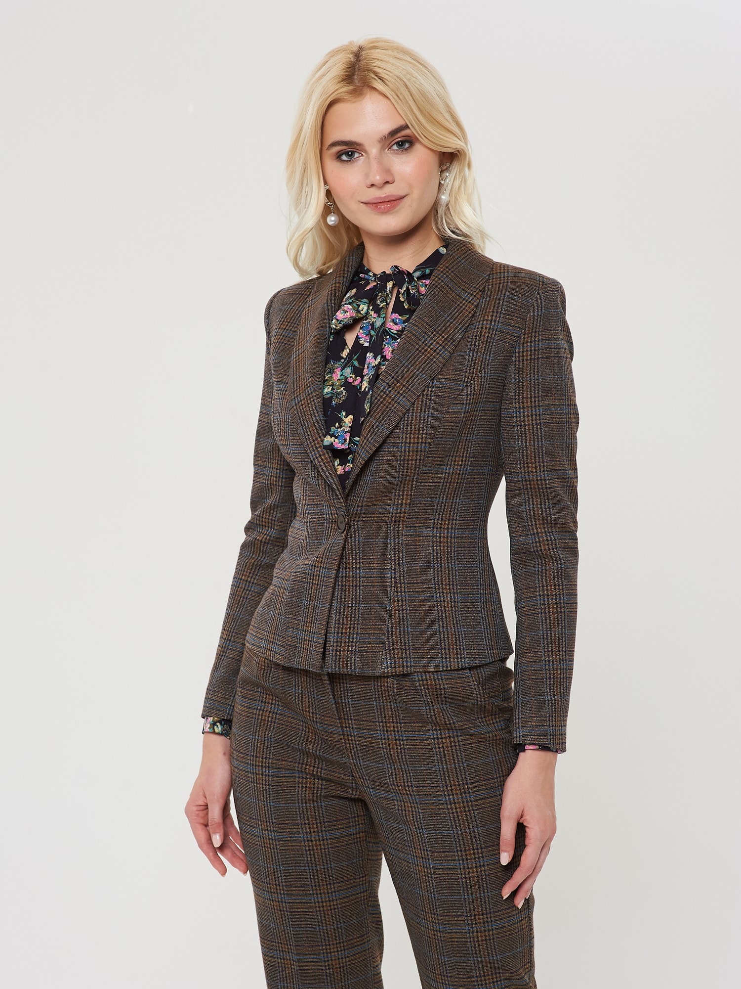 Укороченный приталенный клетчатый жакет на одну пуговицу с шалевым воротником. Этот утонченный жакет прекрасно сочетается с блузкой Д-915 НЕР2(О9) и брюками Б-802 ТФ(О9)