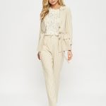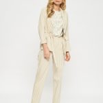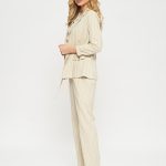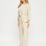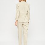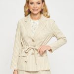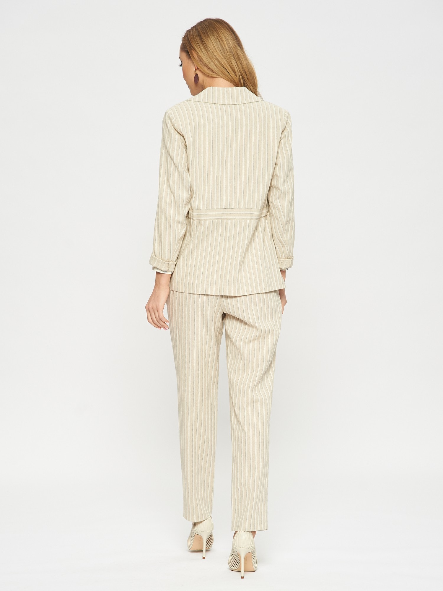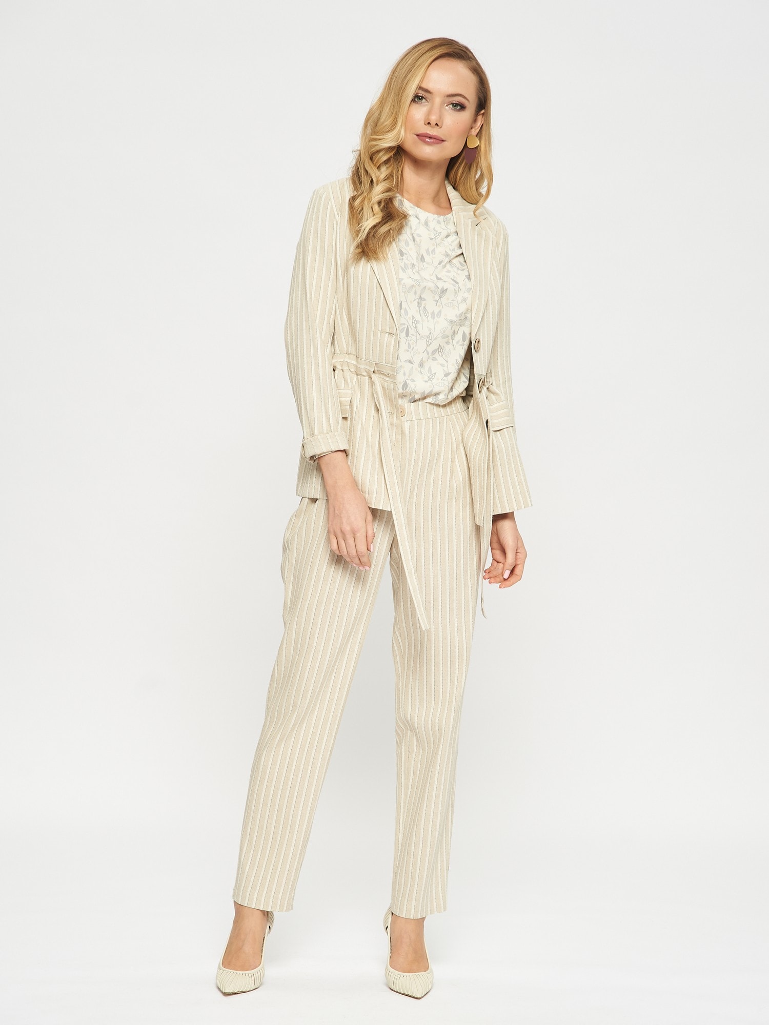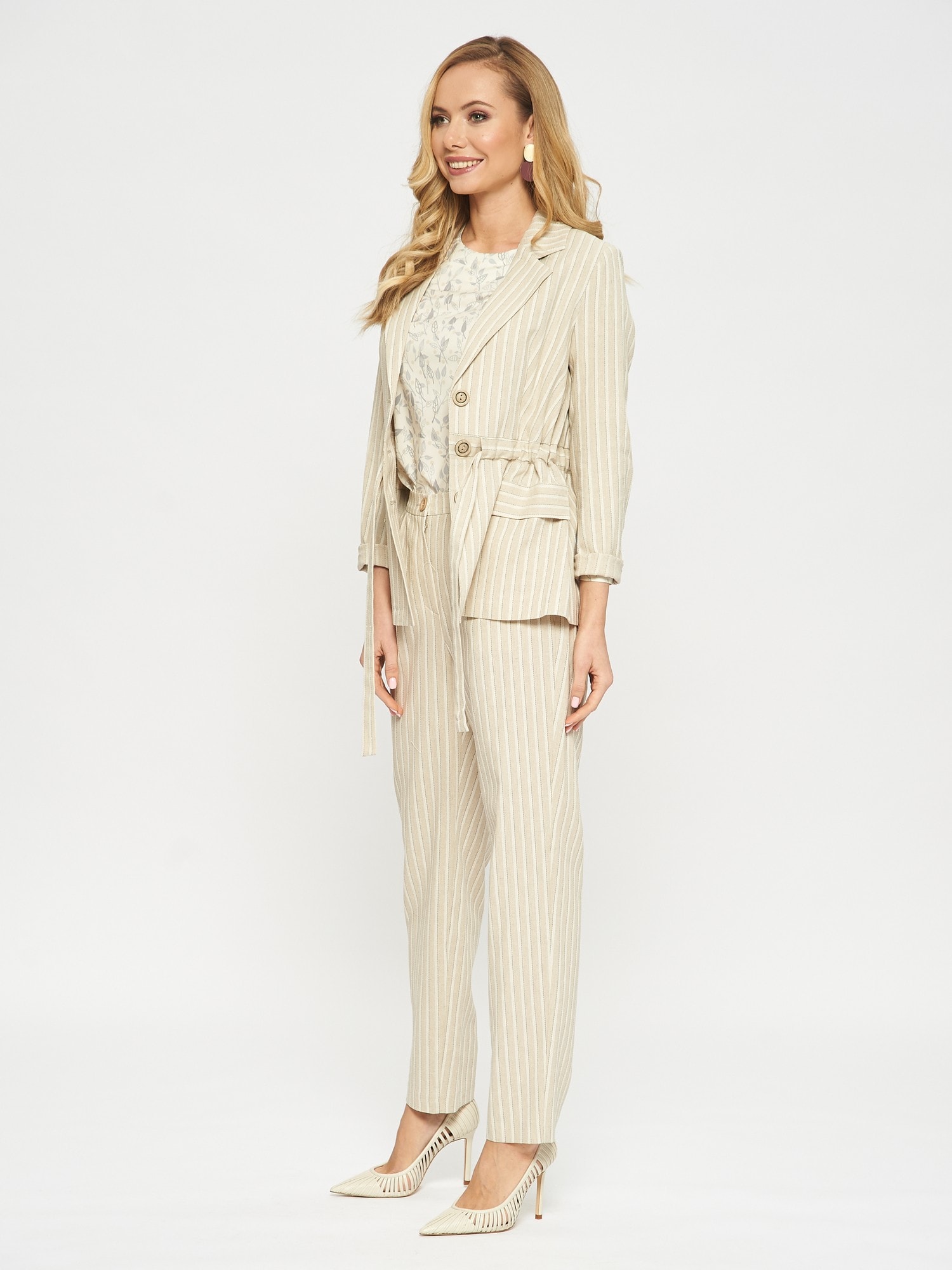 Льняной жакет бежевого цвета в полоску. На линии талии кулиска для подчеркивания талии. Деревянные пуговицы. Дополните образ брюками Б-802 ЛИН(В20). Костюм подойдет как для весны, так и для лета.