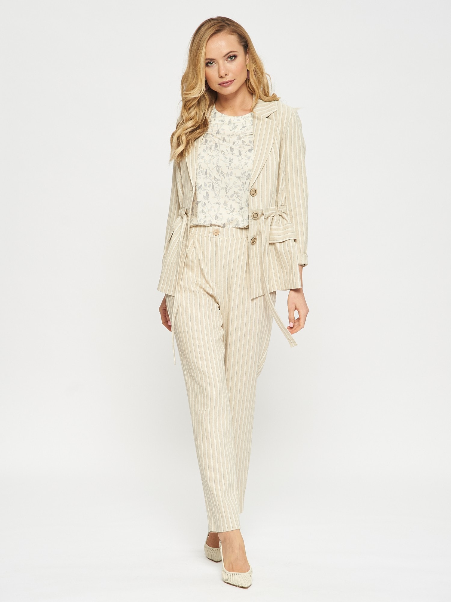 Льняной жакет бежевого цвета в полоску. На линии талии кулиска для подчеркивания талии. Деревянные пуговицы. Дополните образ брюками Б-802 ЛИН(В20). Костюм подойдет как для весны, так и для лета.