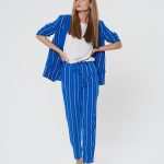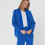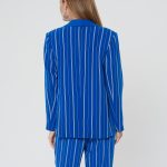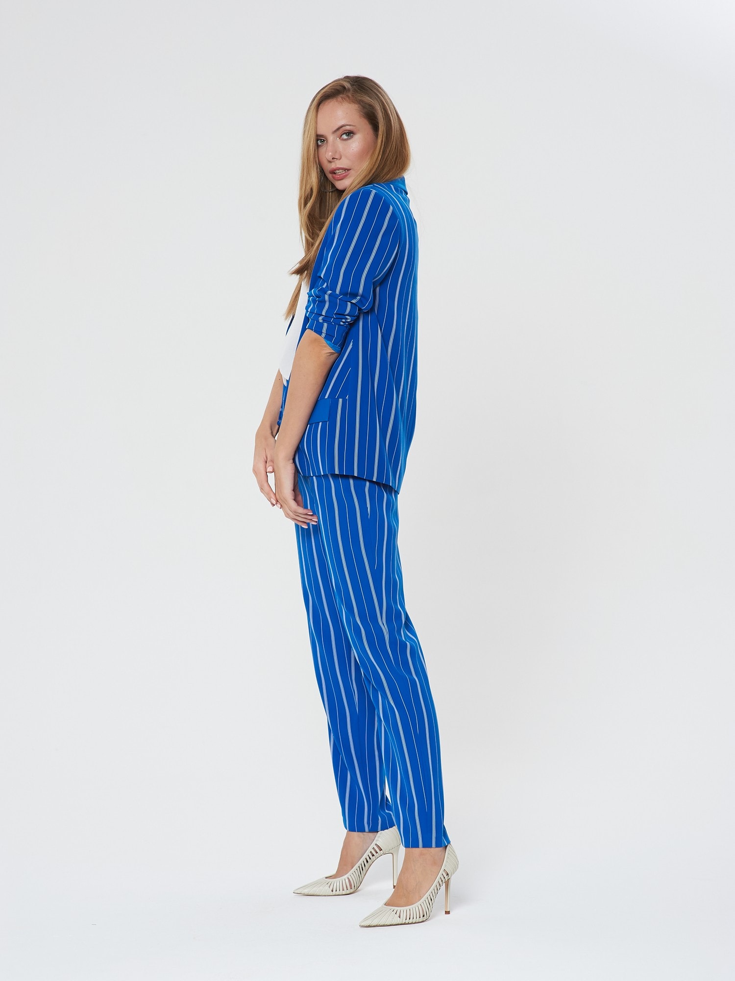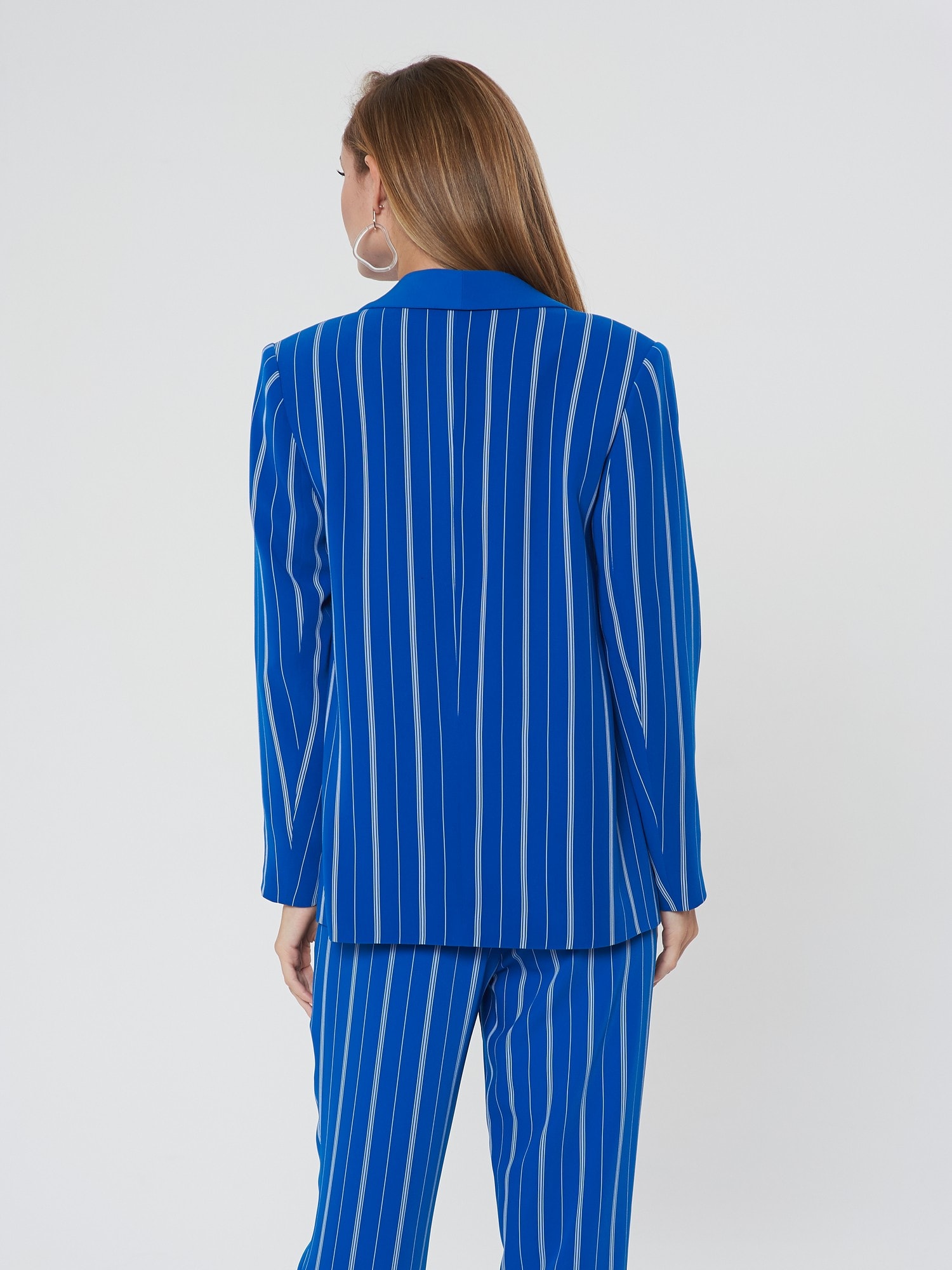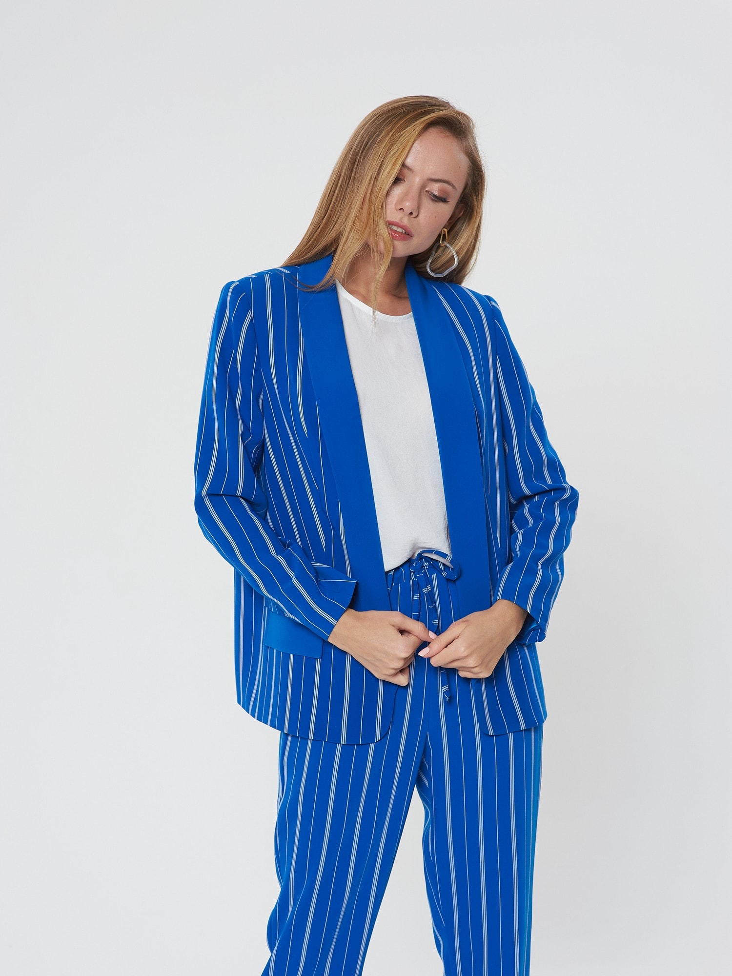 Яркий жакет насыщенного синего цвета в тонкую белую полоску. Шалевый воротник и лацкан гладкого синего цвета. Жакет без застежки, карманы-имитация. Сочетайте с брюками Б-903 ПИН(В20) и блузкой Д-810 ПЛ(В20)