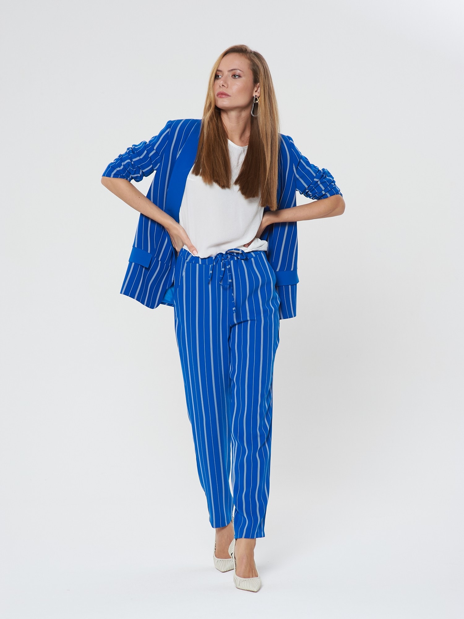 Яркий жакет насыщенного синего цвета в тонкую белую полоску. Шалевый воротник и лацкан гладкого синего цвета. Жакет без застежки, карманы-имитация. Сочетайте с брюками Б-903 ПИН(В20) и блузкой Д-810 ПЛ(В20)