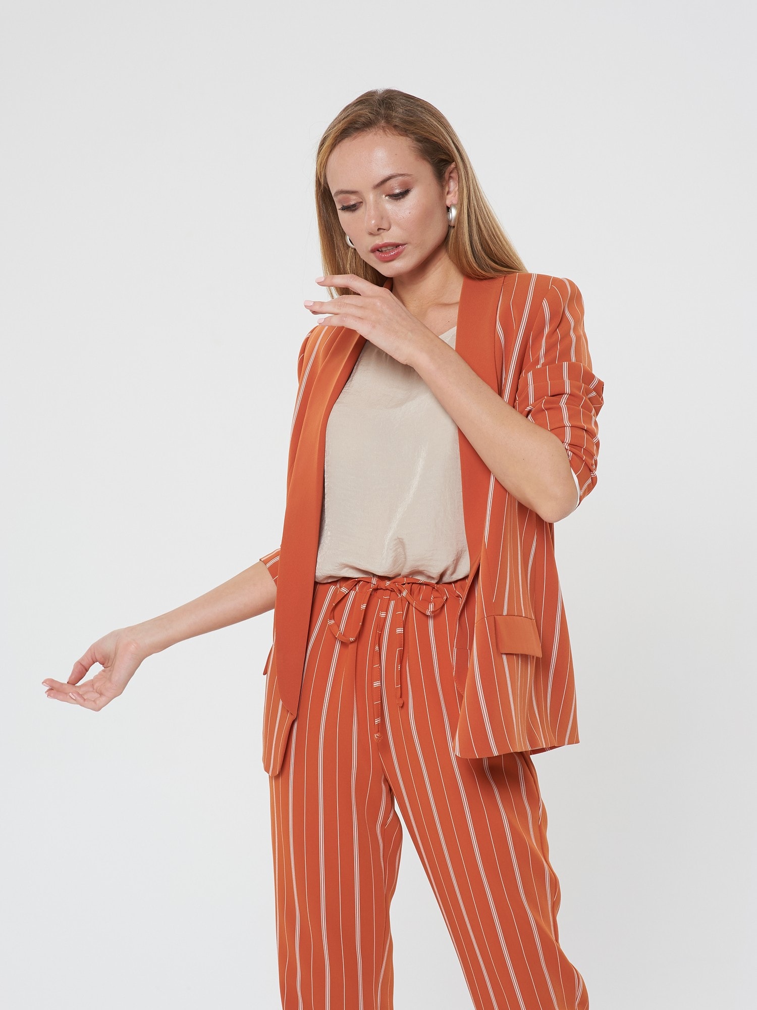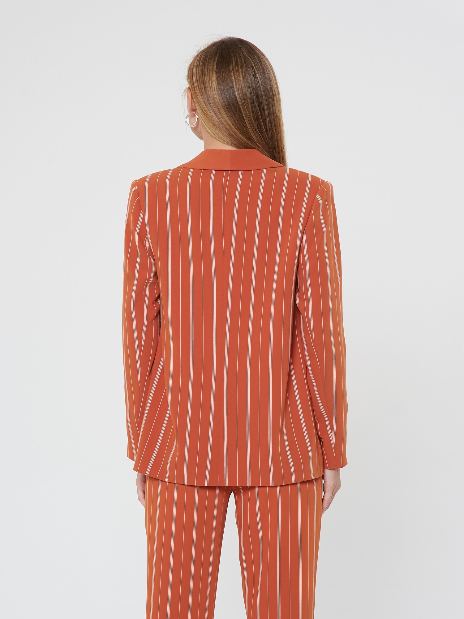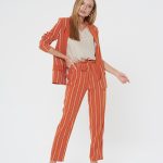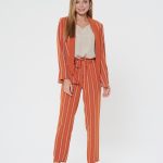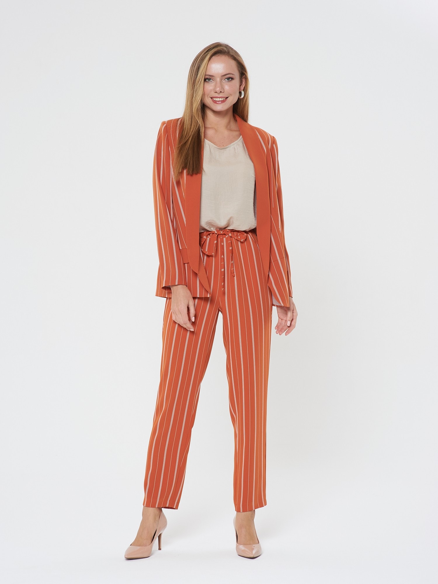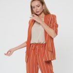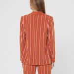 Яркий жакет насыщенного апельсинового цвета в тонкую белую полоску. Шалевый воротник и лацкан гладкого оранжевого цвета. Жакет без застежки, карманы-имитация. Сочетайте с брюками Б-903 ПКМ(В20) и блузкой Д-931 КР(В20)