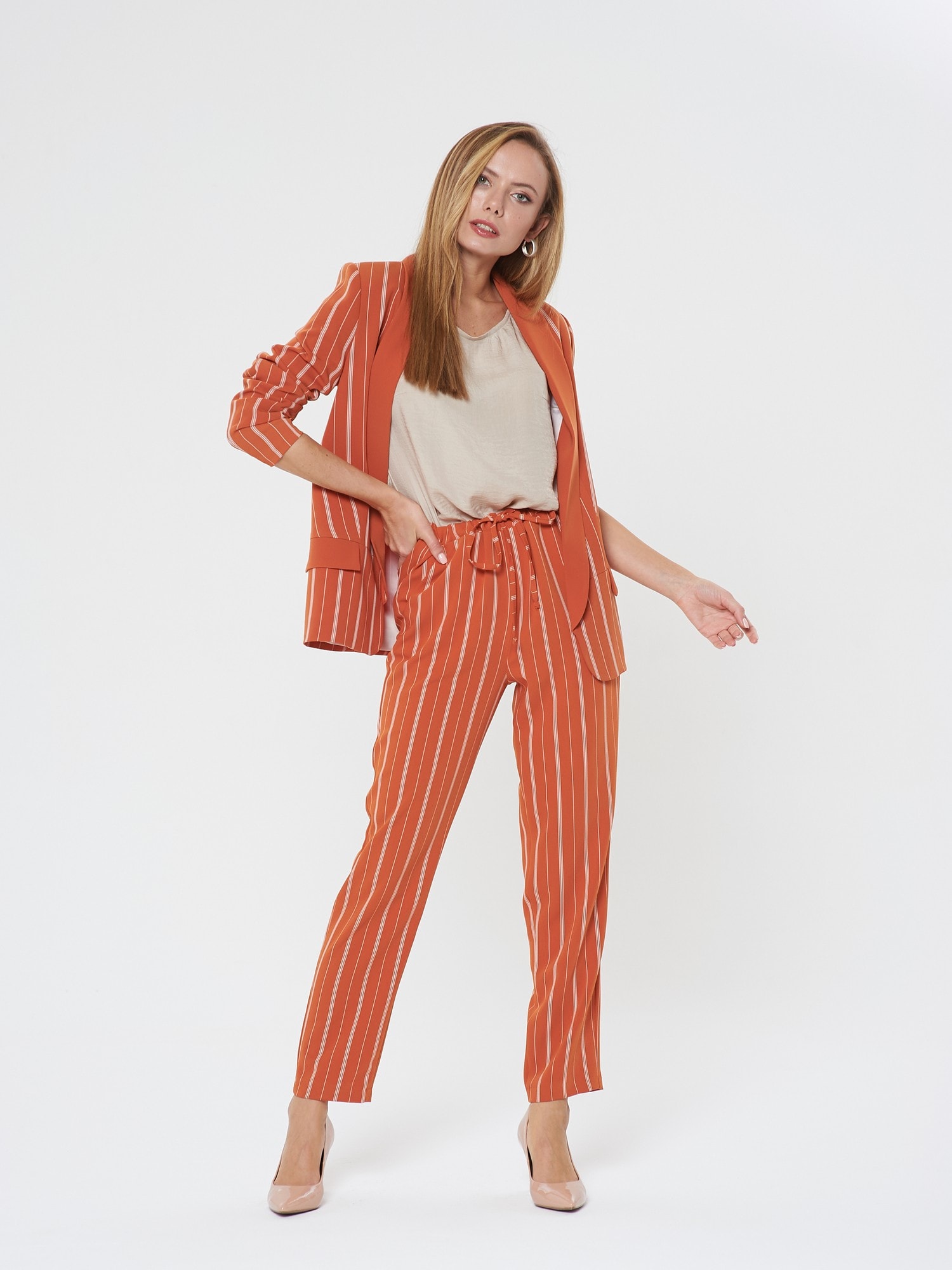 Яркий жакет насыщенного апельсинового цвета в тонкую белую полоску. Шалевый воротник и лацкан гладкого оранжевого цвета. Жакет без застежки, карманы-имитация. Сочетайте с брюками Б-903 ПКМ(В20) и блузкой Д-931 КР(В20)