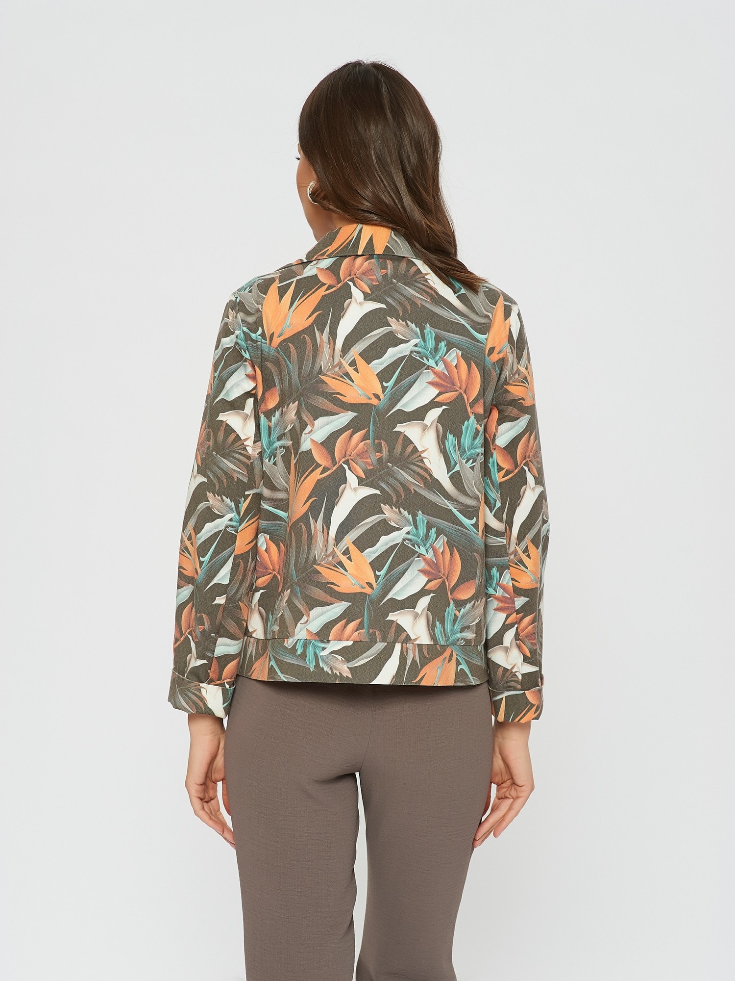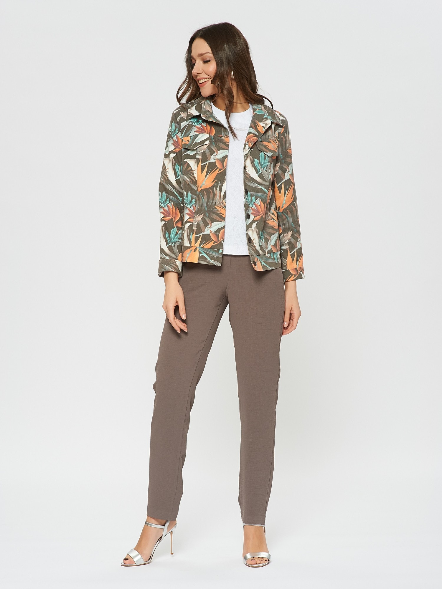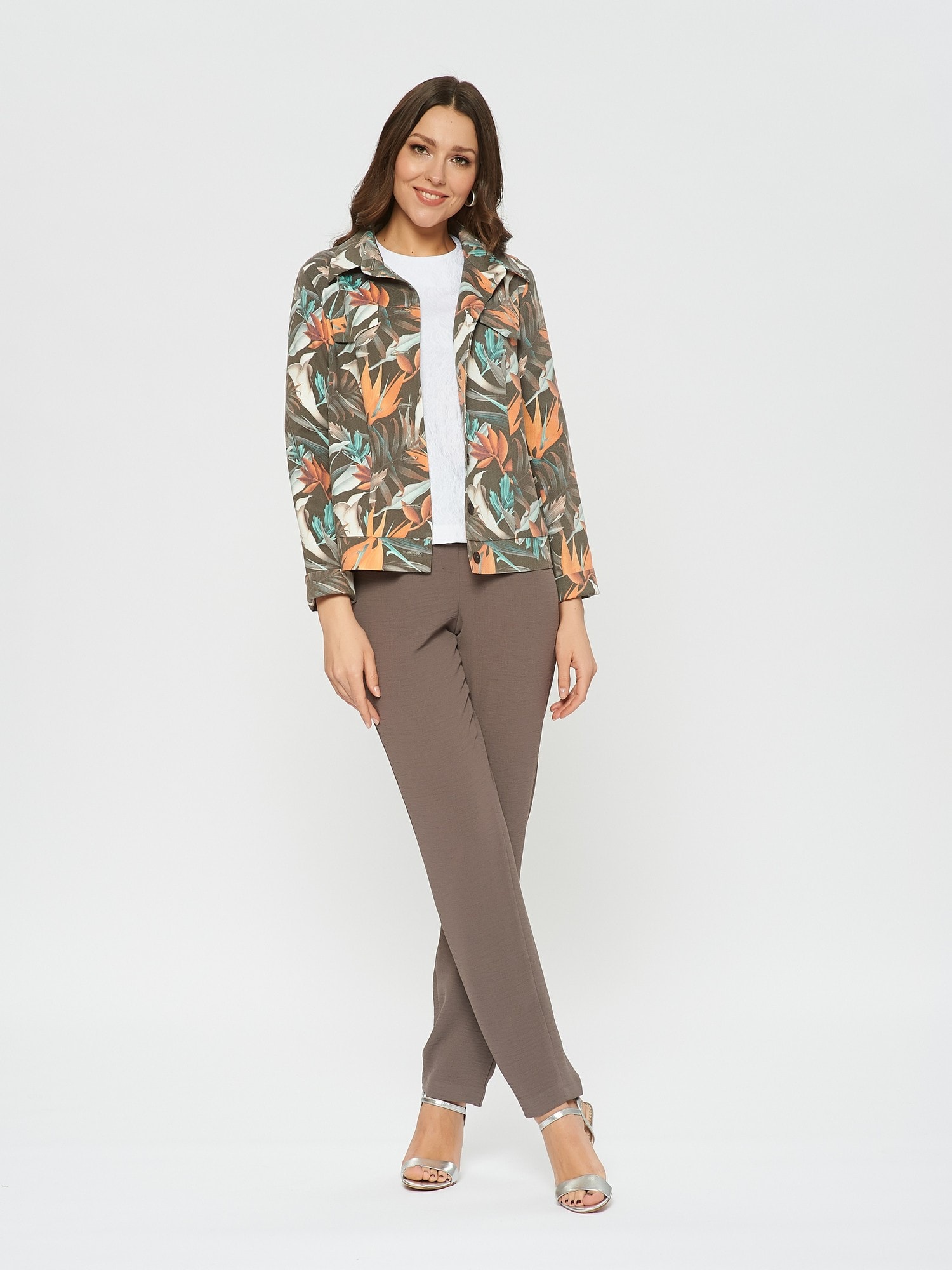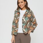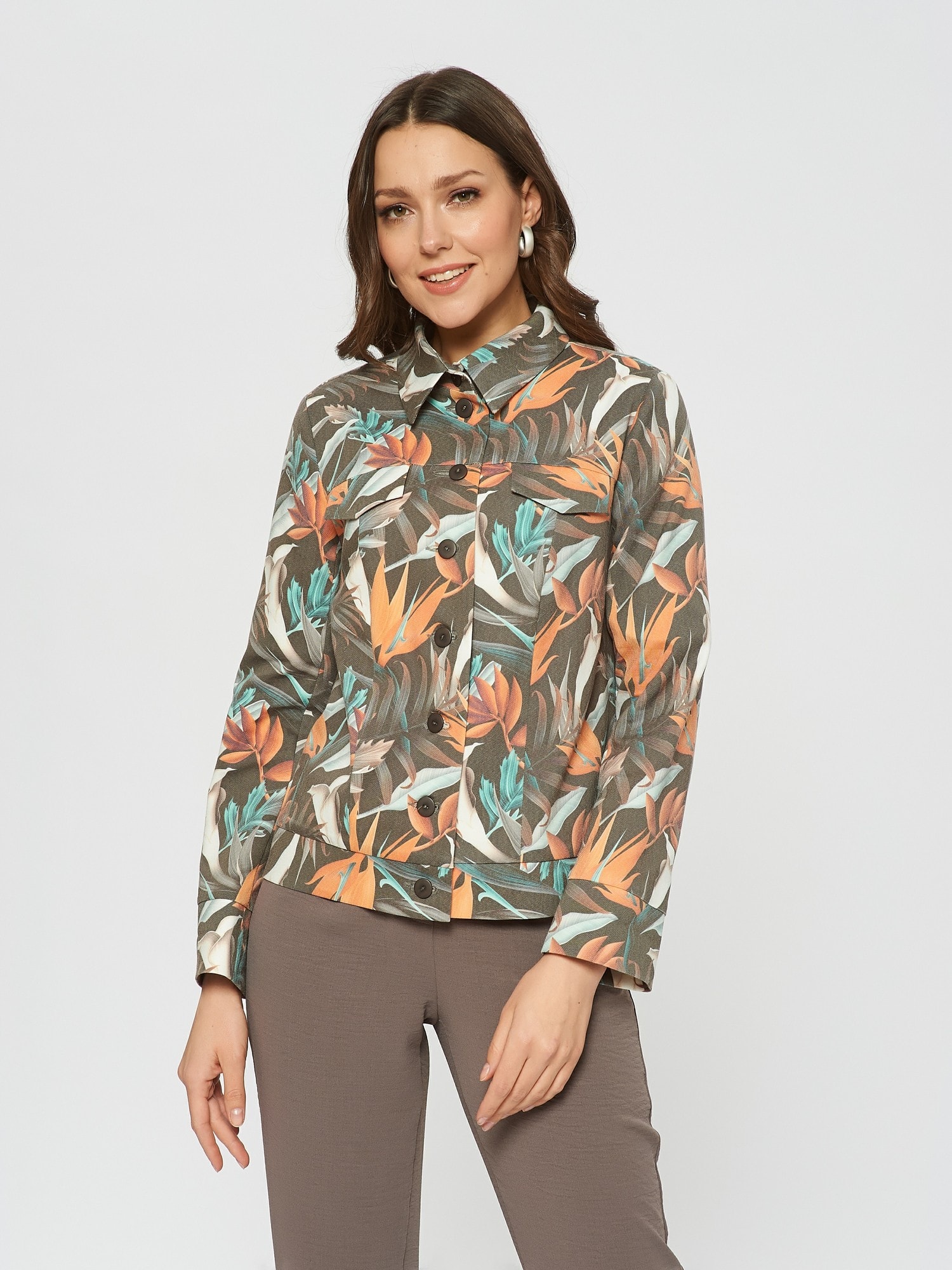 Состав ткани:Хлопок 55%, ПЭ 40%, Эластан 5% Рост фотомодели: 175 см Жакет на пуговицах с тропическим принтом. Прямой крой, планка с пуговицами по всей длине. Имитация карманов в виде клапанов на груди. Дополните образ брюками Б-802 ТРЮ(В20) или платьем-футляром П-951 ОС(В20)