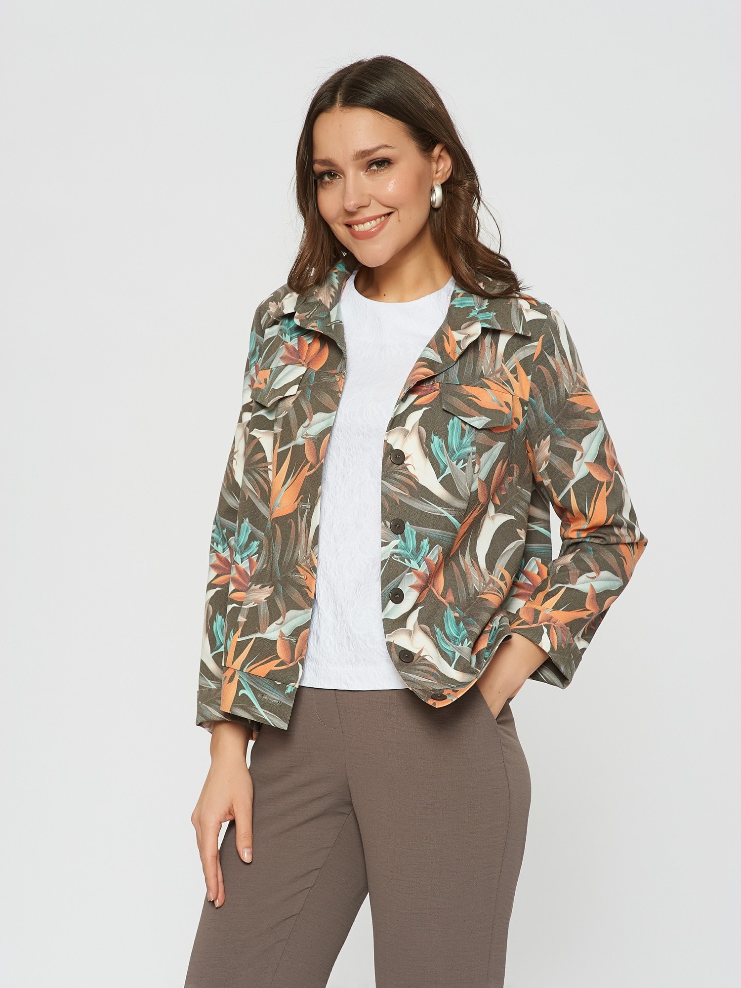 Состав ткани:Хлопок 55%, ПЭ 40%, Эластан 5% Рост фотомодели: 175 см Жакет на пуговицах с тропическим принтом. Прямой крой, планка с пуговицами по всей длине. Имитация карманов в виде клапанов на груди. Дополните образ брюками Б-802 ТРЮ(В20) или платьем-футляром П-951 ОС(В20)