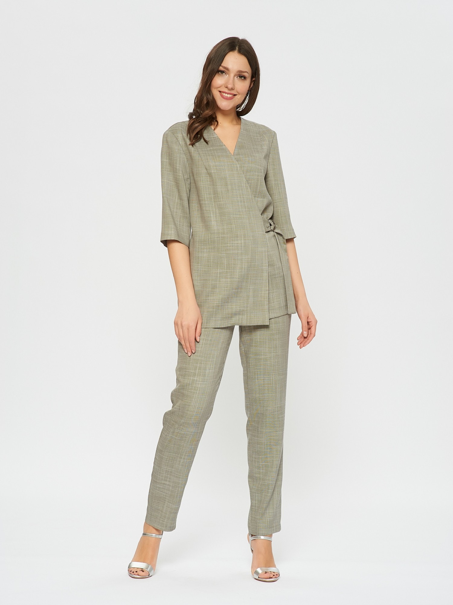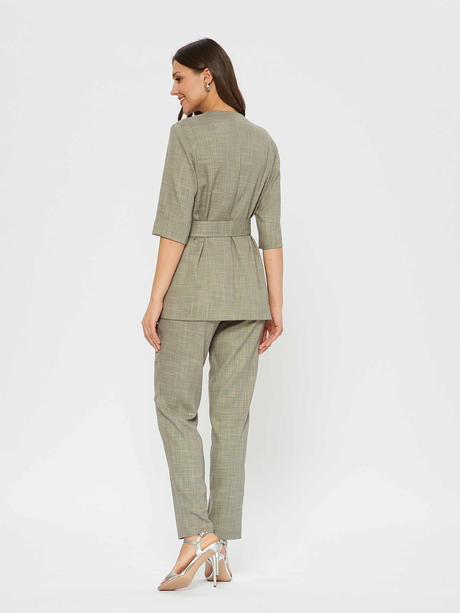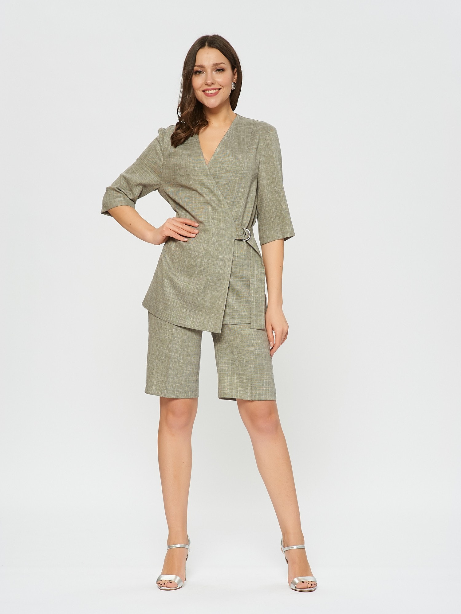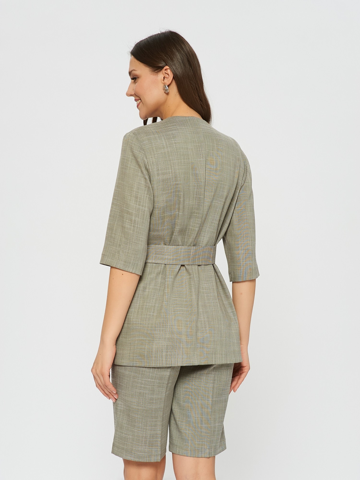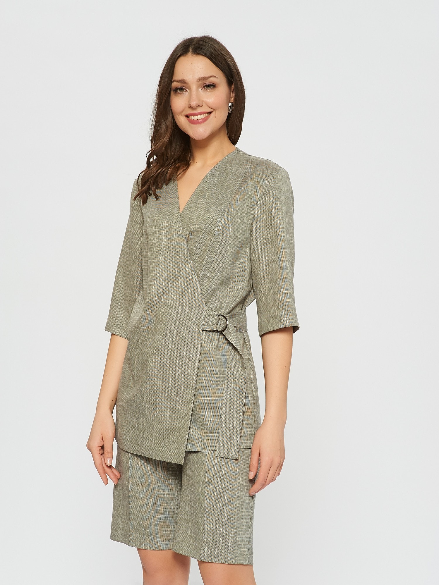 Жакет с рукавами до локтя. Выполнен из серой фактурной ткани. Модель с симетричным поясом с металлической пряжкой. Для полного образа дополните шортами Б-904 ГРИ(В20) или брюками Б-905 ГРИ(В20)