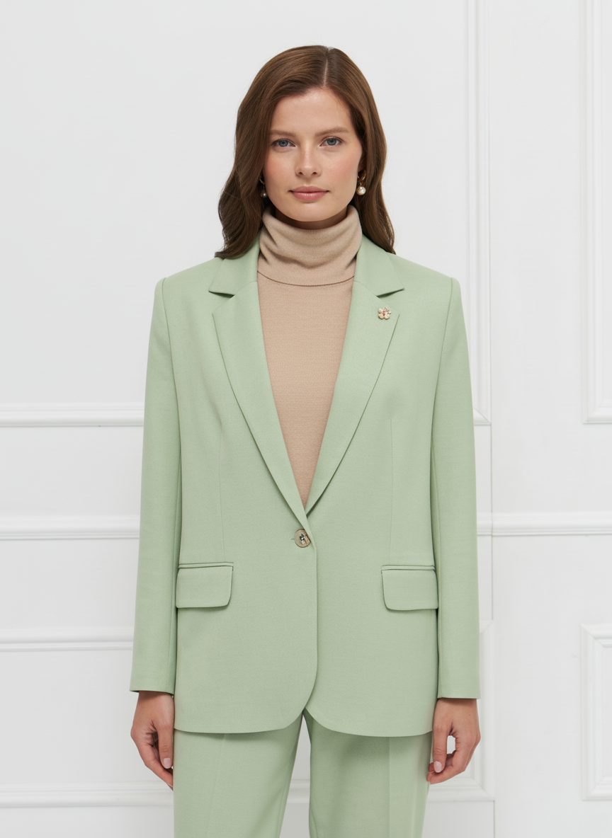 Жакет выполнен в приглушенном салатовом цвете -универсальный вариант для делового гардероба. Модель полуприлегающего силуэта, подчеркивающего фигуру, но сохраняющего комфорт. Застежка на одну пуговицу добавляет аккуратный акцент. Прорезные карманы с клапанами подчеркивают строгость образа. Жакет на подкладке, что обеспечивает дополнительную структуру и удобство в носке. Ткань держит форму и подходит для межсезонья. Эта модель легко сочетается с брюками и юбками базовых оттенков. На фото в паре Брюки Б-704 ОЛИ(О5).