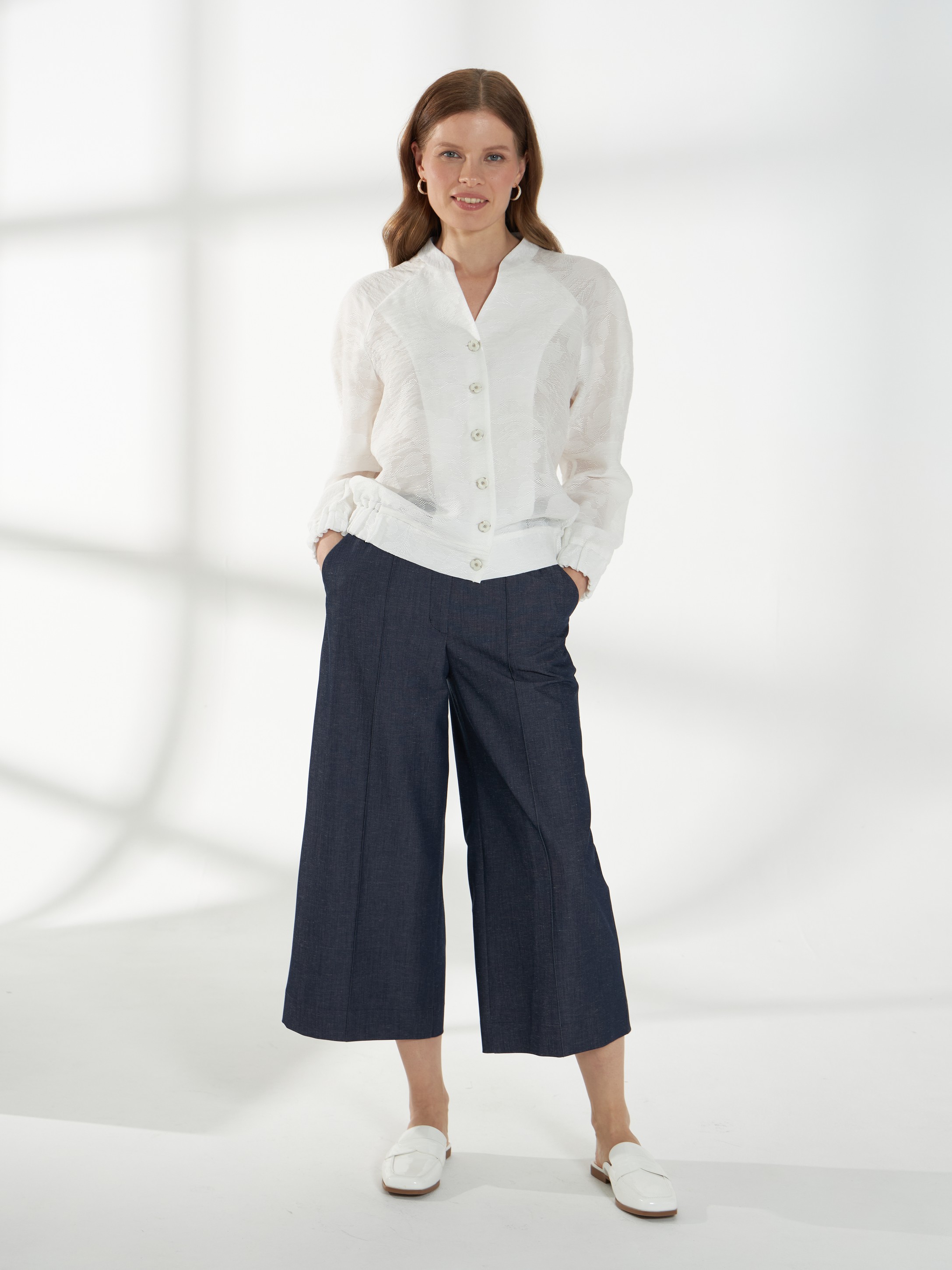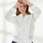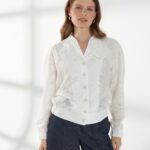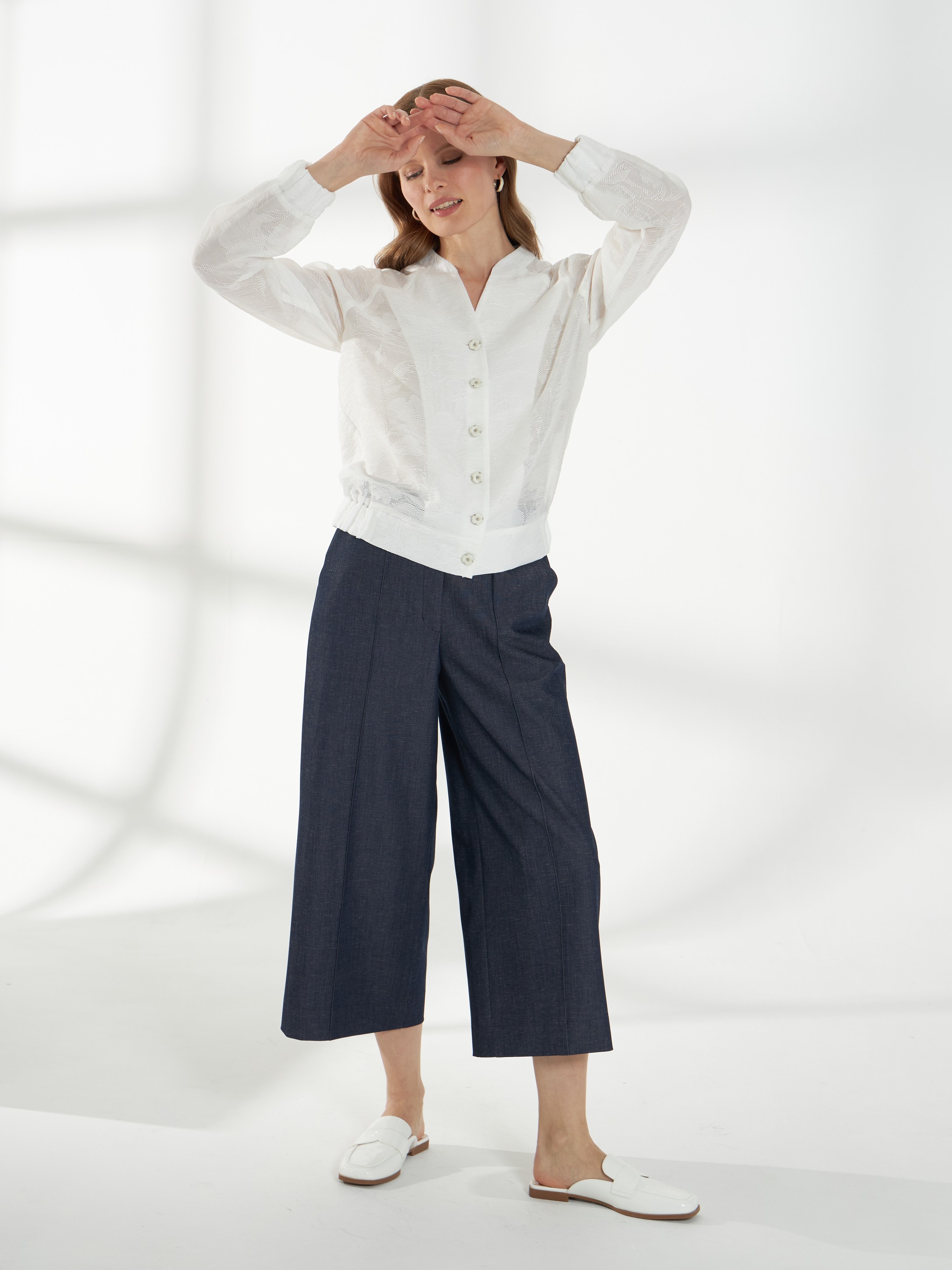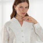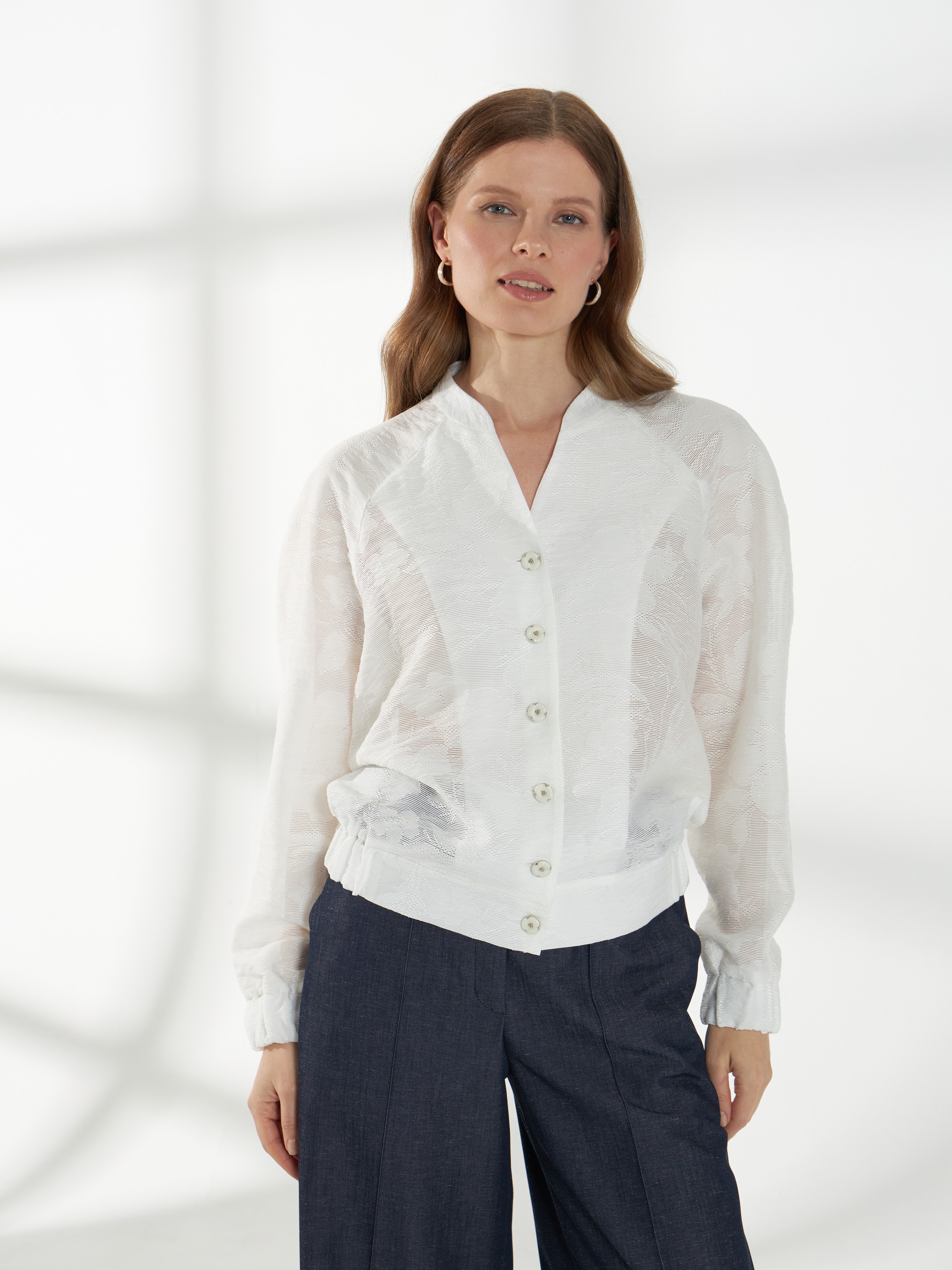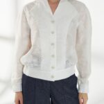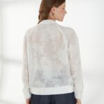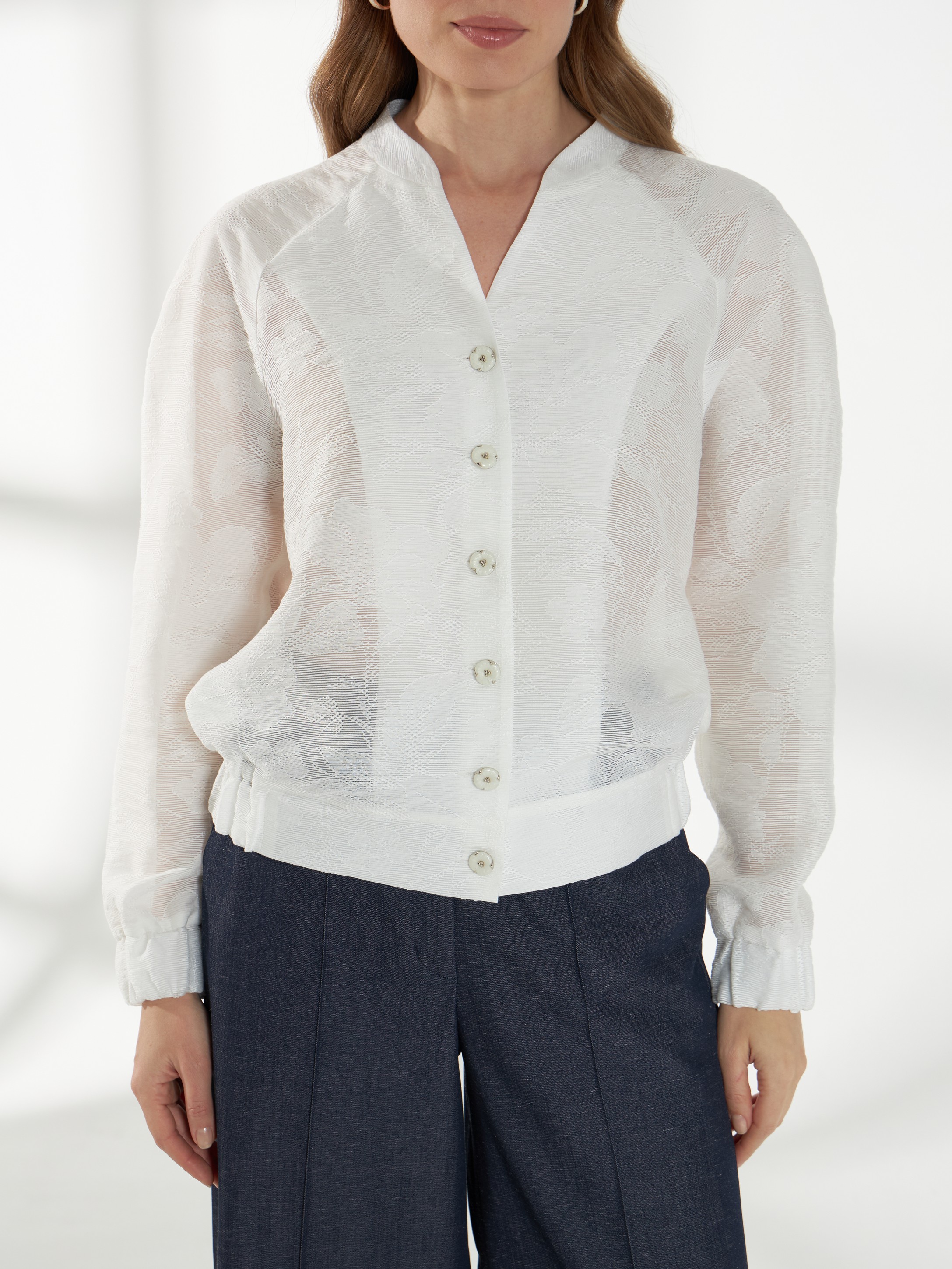 Элегантный жакет из полупрозрачного кружева с вискозой в составе-идеальный выбор для особых выходов. Легкая фактура и деликатная прозрачность создают утончённый и выразительный образ. Свободный силуэт с рукавами реглан обеспечивает комфортную посадку. V-образный вырез дополнен воротником-стойкой, подчеркивающим линию шеи. Низ жакета и манжеты присобраны внутренней резинкой, формируя мягкий объем. Застежка на изящные пуговицы завершает модель аккуратным акцентом. Жакет в молочном оттенке на фото представлен с брюками Б-2054 ДКС(В6).
