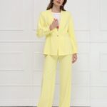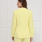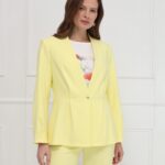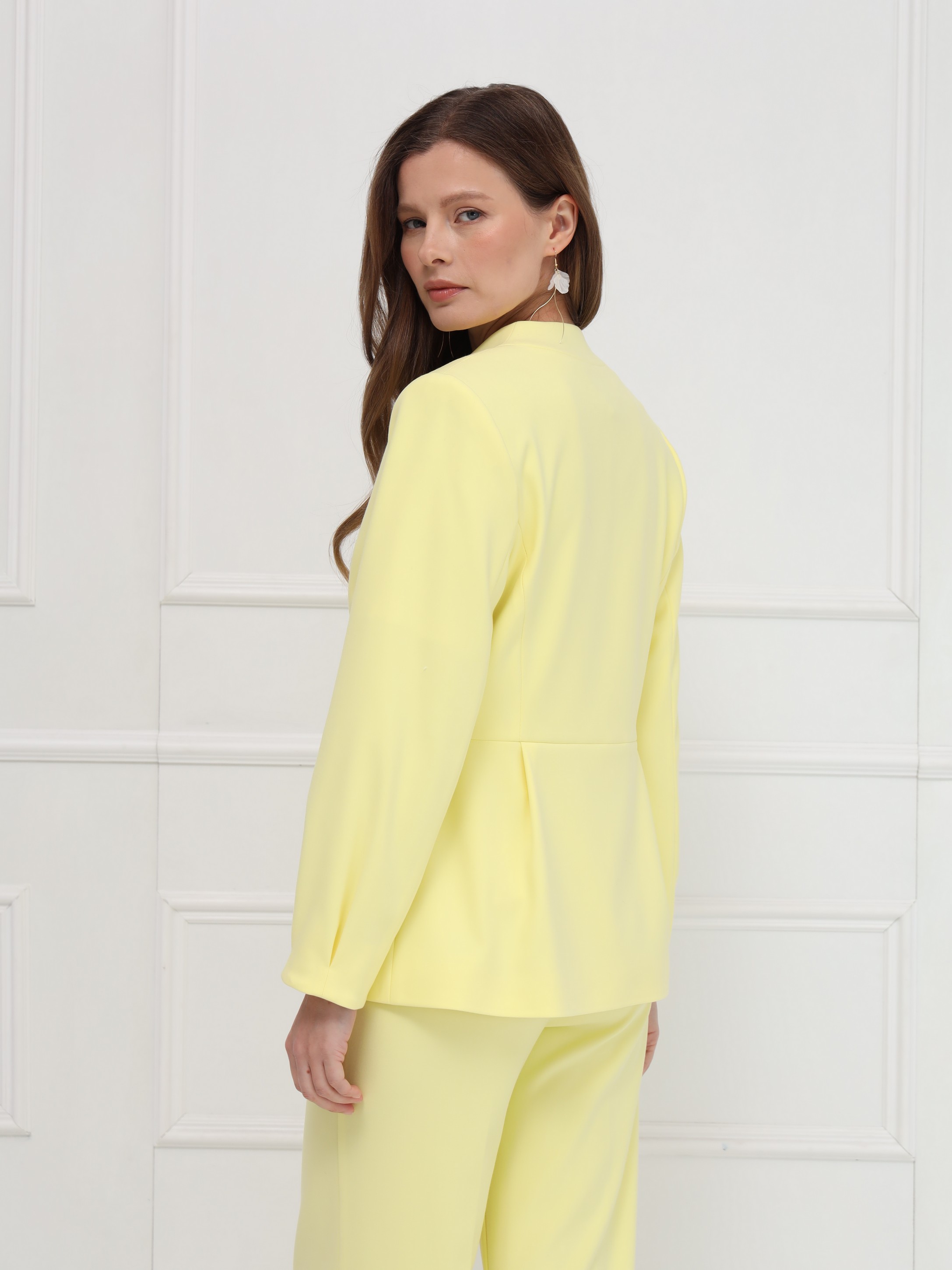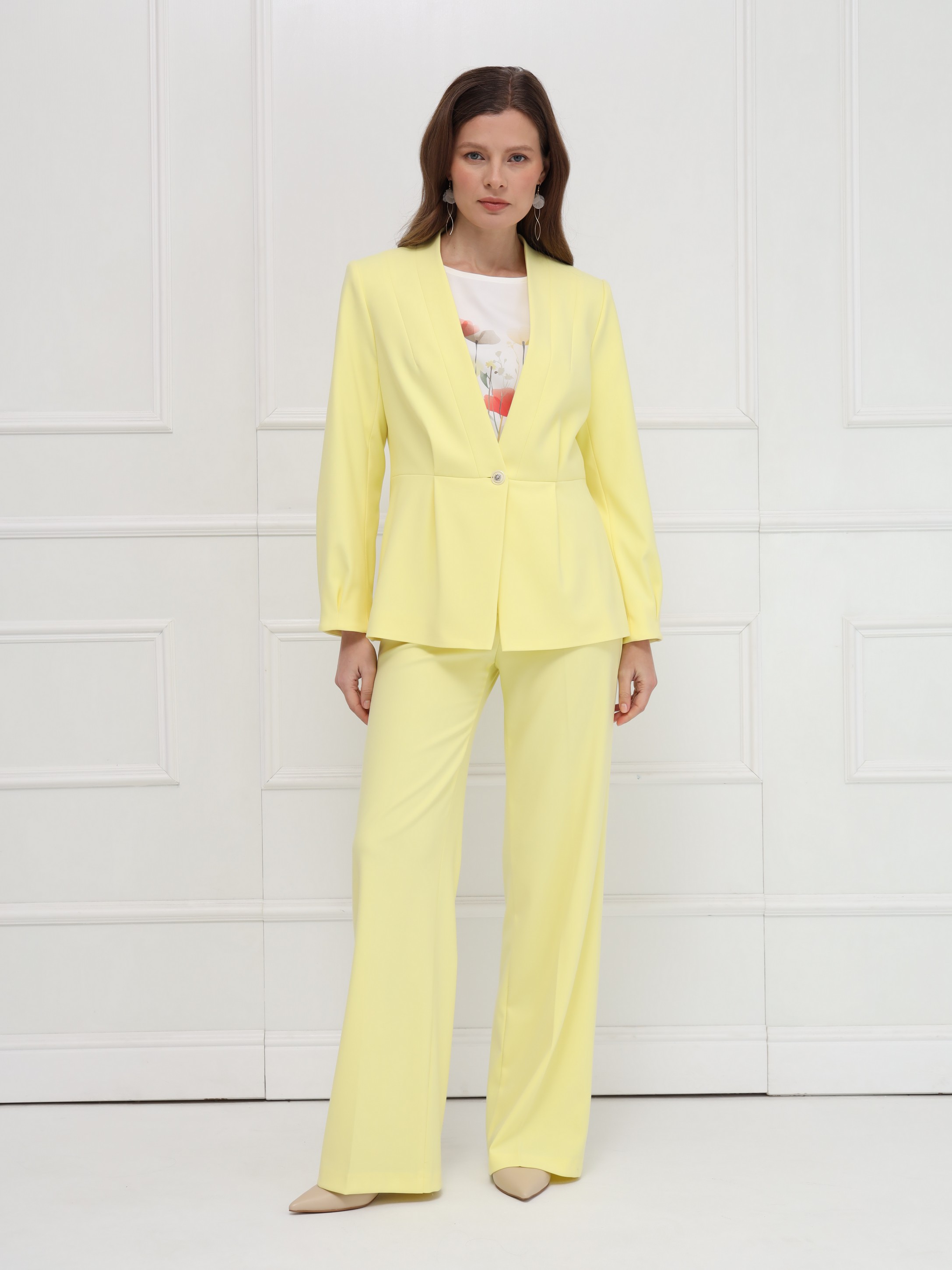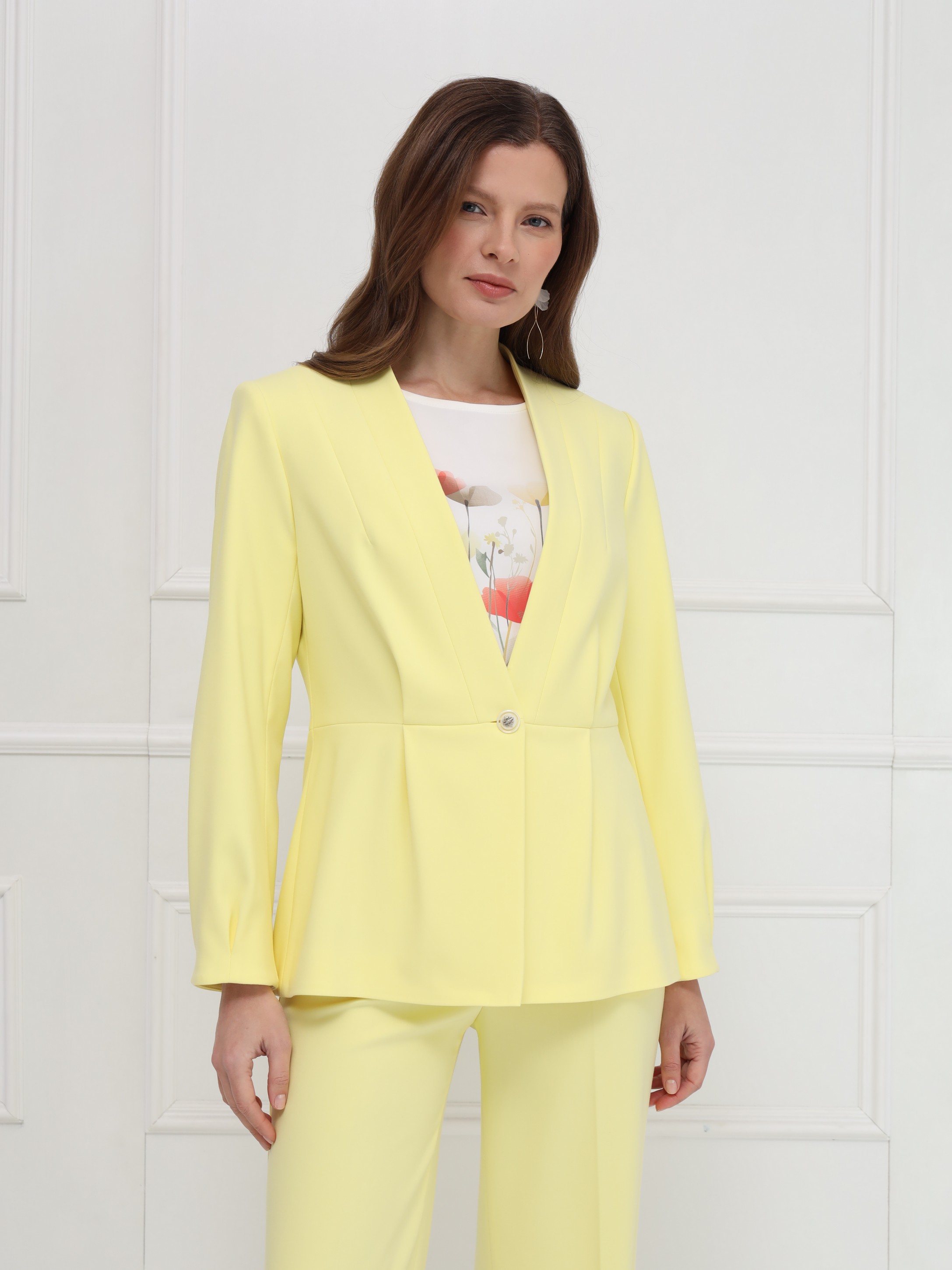 Изящный жакет без воротника, наполненный солнечной энергией. Отрезная баскаи мягкие складки по талии создают лёгкий объём и подчёркивают женственный силуэт, а складки у рукавов добавляют плавности движению. Лаконичная застёжка на одну пуговицу и подкладка делают модель удобной и утончённой. На фото жакет представлен с блузкой Д-209 ТЛЕ(В6), брюками Б-2021 АКА(В6).