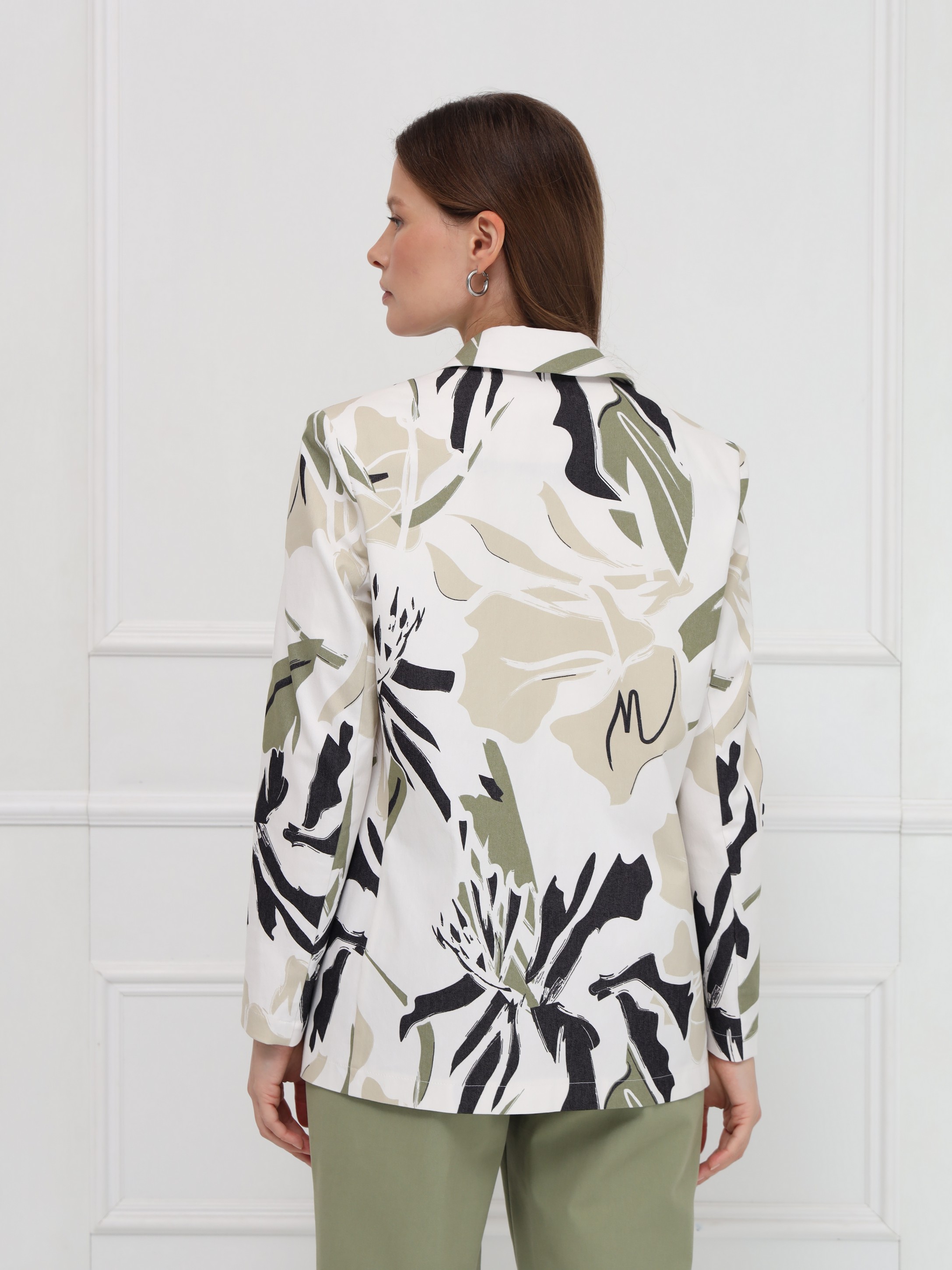 Яркий хлопковый жакет с абстрактным разноцветным принтом станет эффектным акцентом вашего гардероба. Лёгкая модель без подкладки обеспечивает комфорт и свободу движений, а прямой силуэт и аккуратная линия плеч создают современный, структурированный образ. Узкие лацканы добавляют изящества, накладные карманы с клапанами делают жакет практичным, а застёжка на две пуговицы подчёркивает классический характер. Идеален для повседневных и городских образов - легко сочетается с джинсами, брюками и однотонными платьями. На фото жакет представлен с брюками Б-2053 ОЛХ(В6).