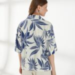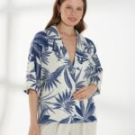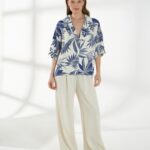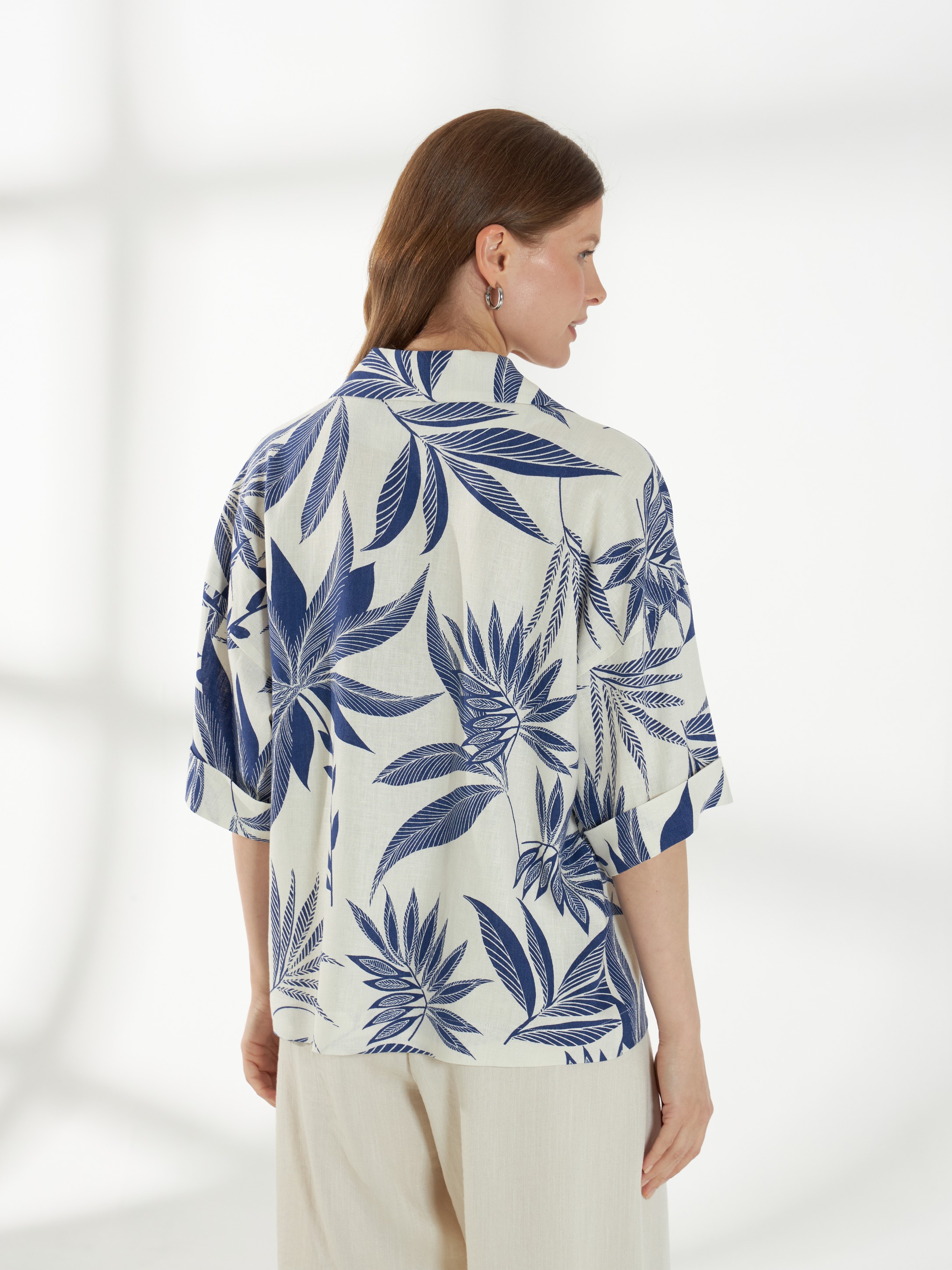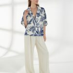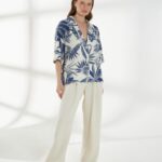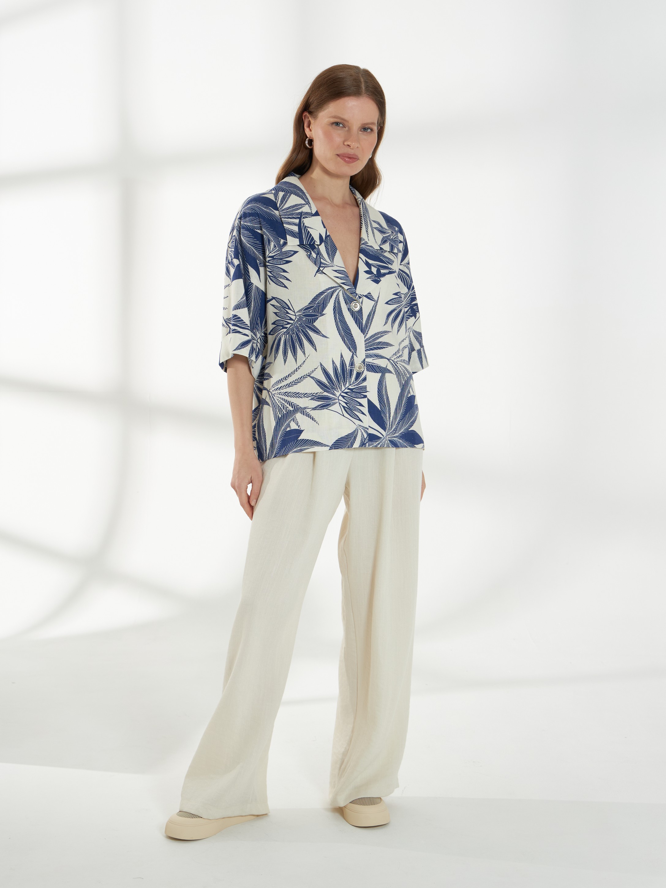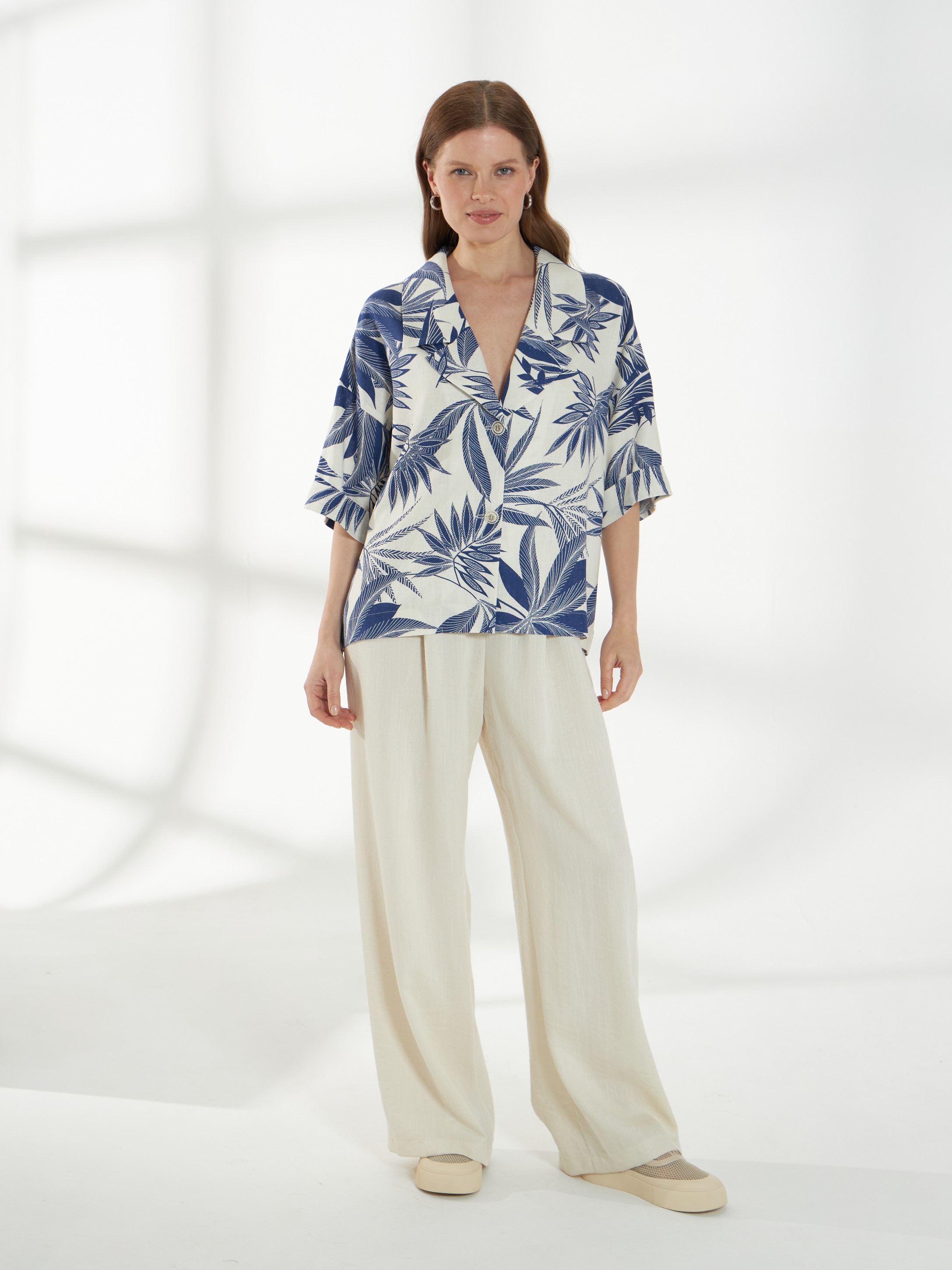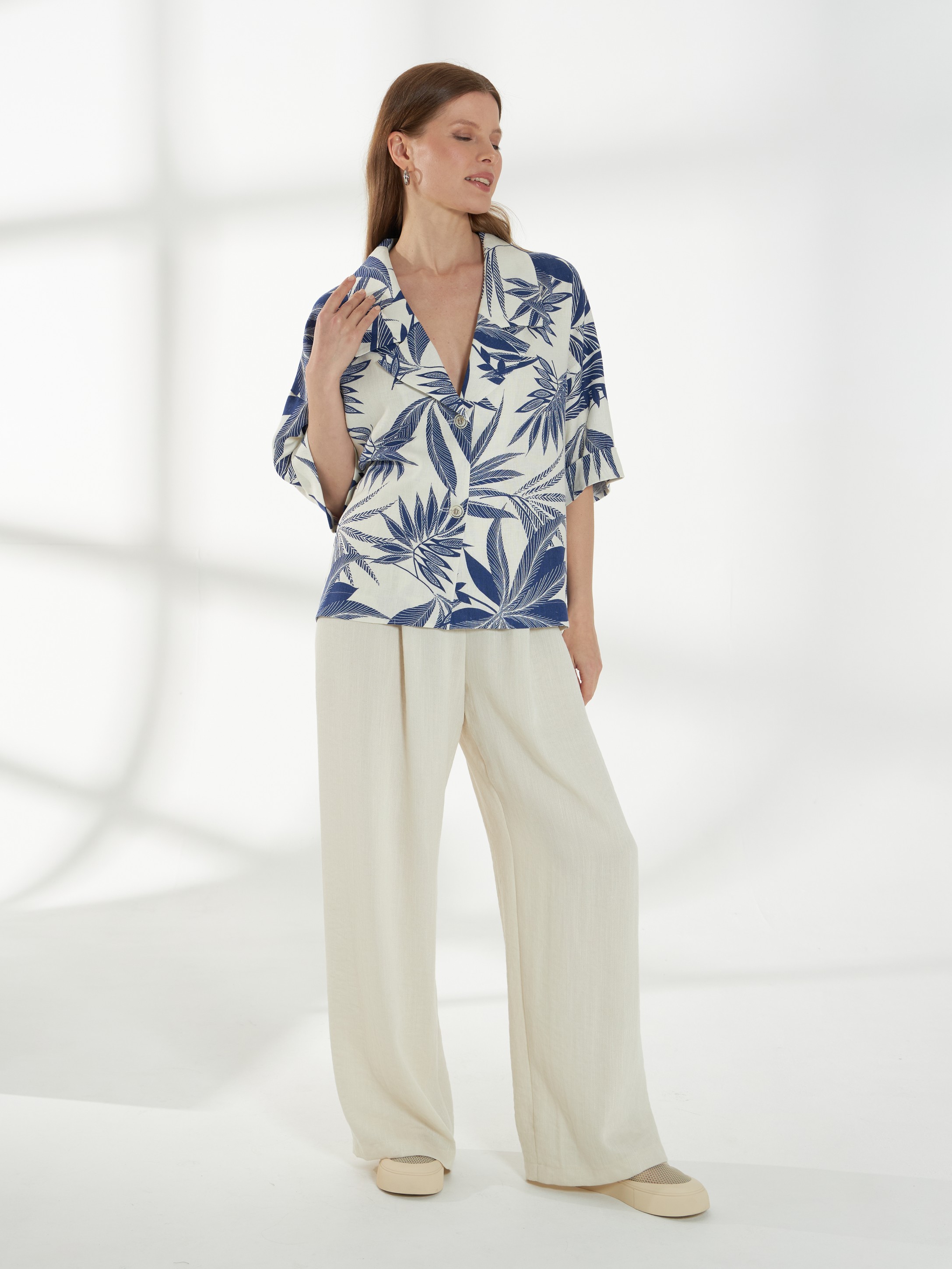 Прямой жакет-блейзер из ткани со льном, с крупным контрастным принтом. Модель со спущенной линией плеча и короткими рукавами создаёт лёгкий и непринуждённый силуэт. Английский воротник с широкими лацканами и застежка на две пуговицы придают жакету аккуратность и современный стиль, делая его универсальной деталью гардероба. На фото жакет представлен с брюками Б-2057 МЛН(В6).