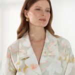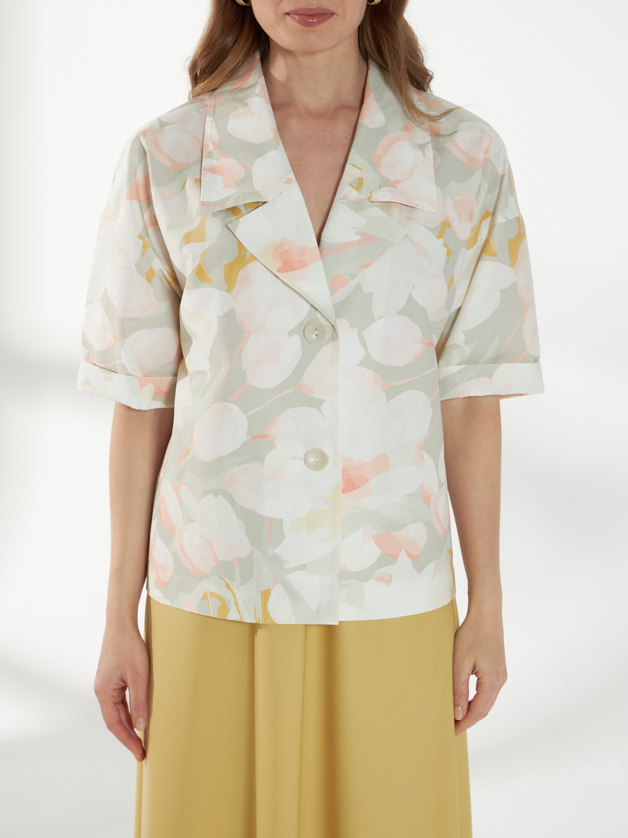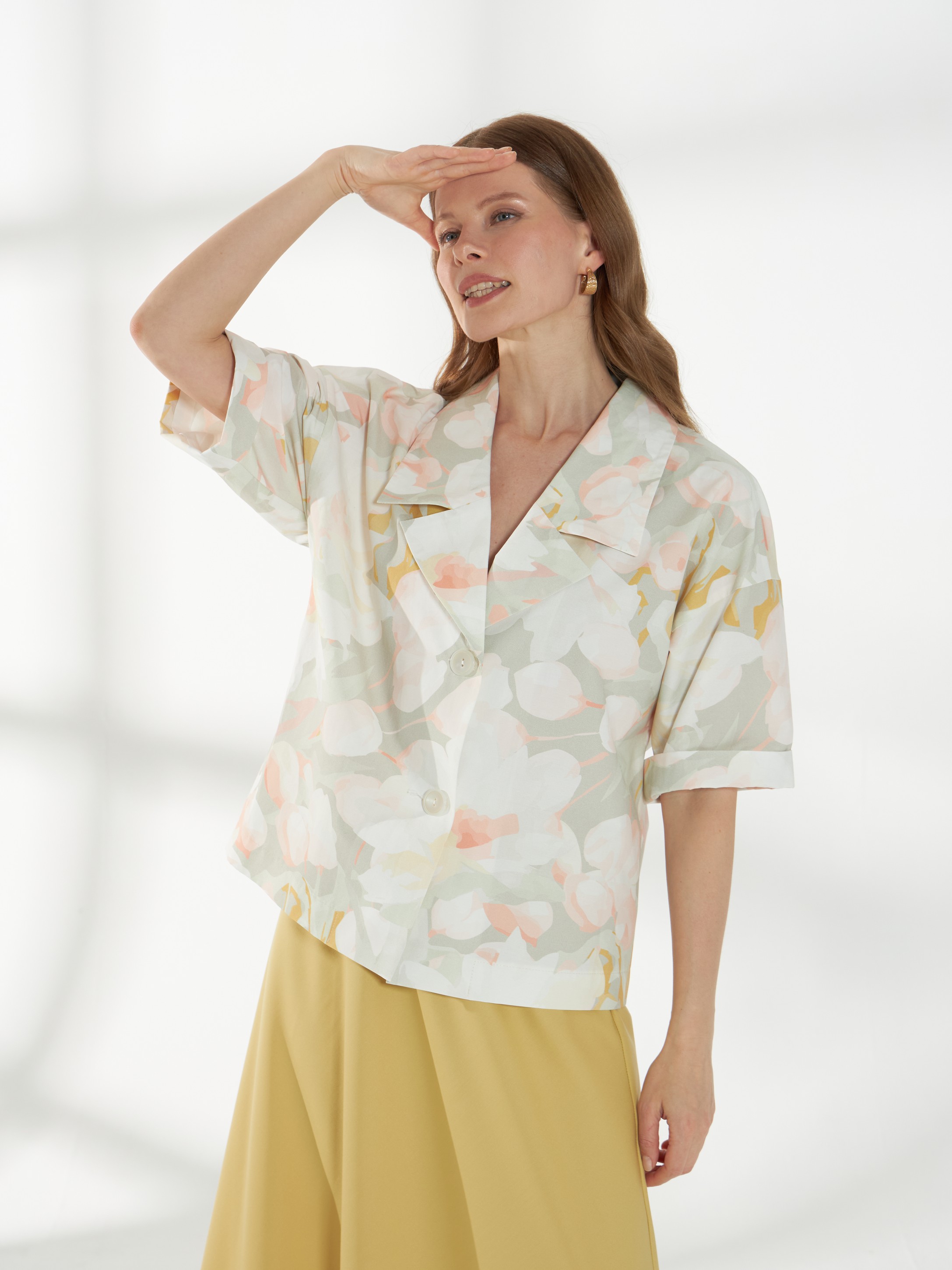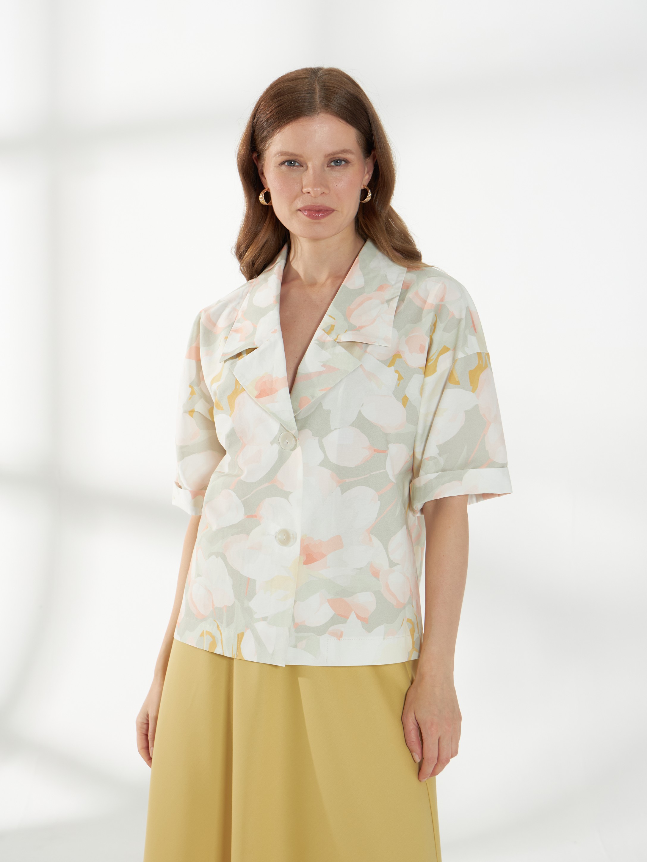 Прямой жакет-блейзер из хлопка, с мягким размытым цветочным принтом. Модель со спущенной линией плеча и короткими рукавами создаёт лёгкий и непринуждённый силуэт. Английский воротник с широкими лацканами и застежка на две пуговицы придают жакету аккуратность и современный стиль, делая его универсальной деталью гардероба. На фото жакет представлен с юбкой А-2036 ГРЧ(В6) и А-2036 ПАО(В6).
