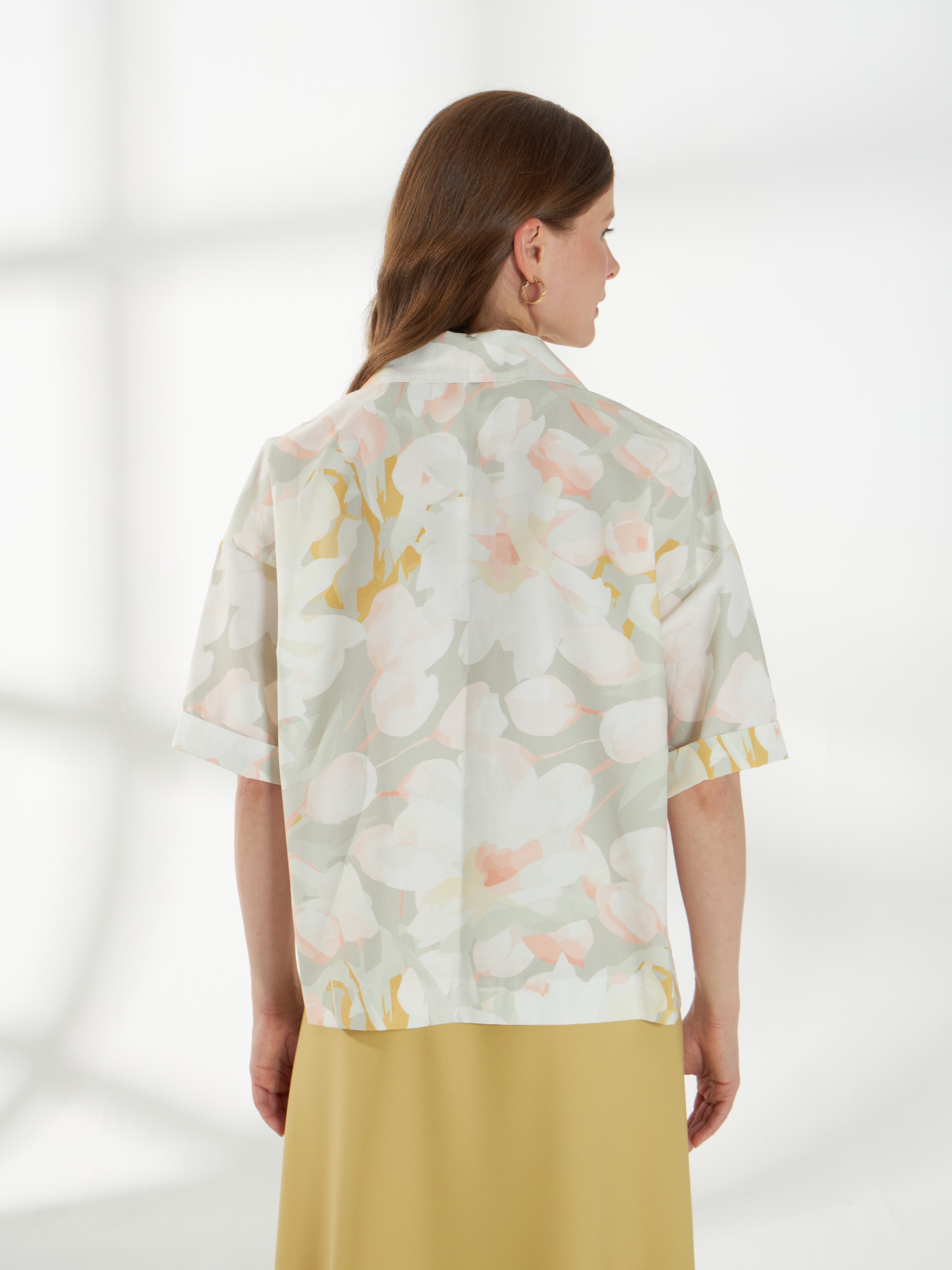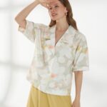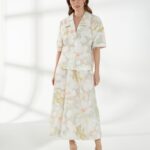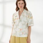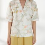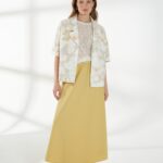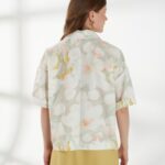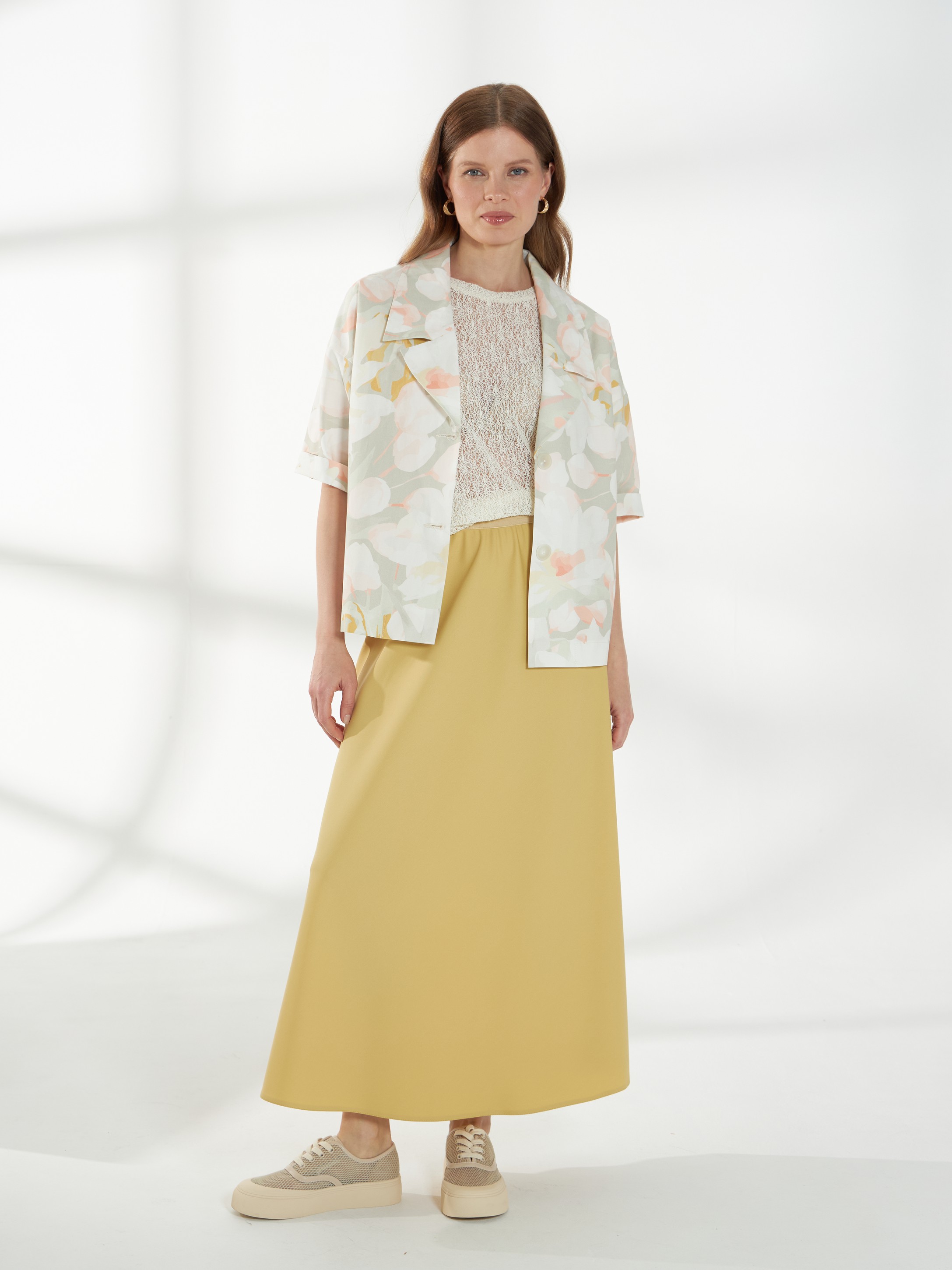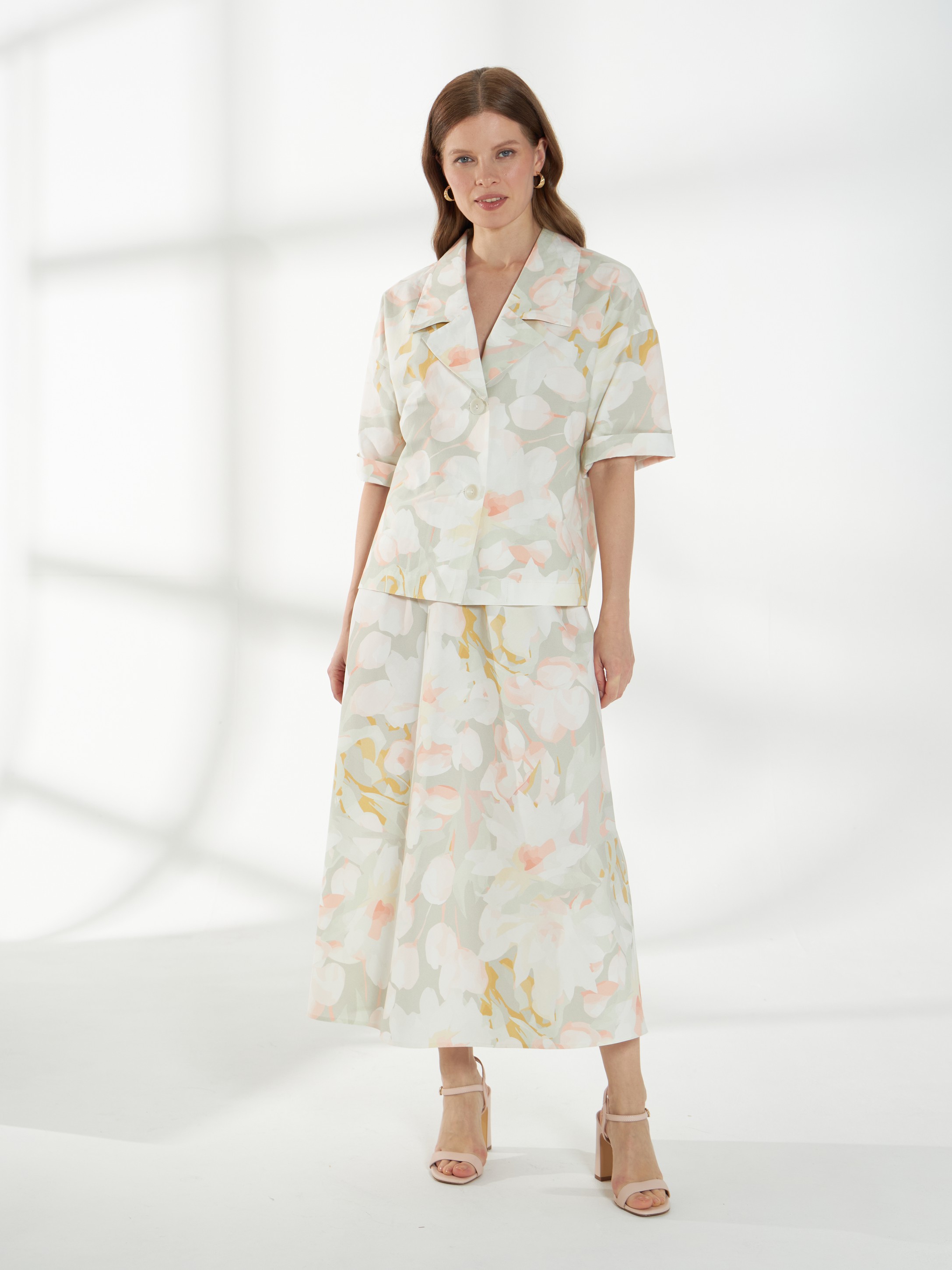 Прямой жакет-блейзер из хлопка, с мягким размытым цветочным принтом. Модель со спущенной линией плеча и короткими рукавами создаёт лёгкий и непринуждённый силуэт. Английский воротник с широкими лацканами и застежка на две пуговицы придают жакету аккуратность и современный стиль, делая его универсальной деталью гардероба. На фото жакет представлен с юбкой А-2036 ГРЧ(В6) и А-2036 ПАО(В6).