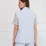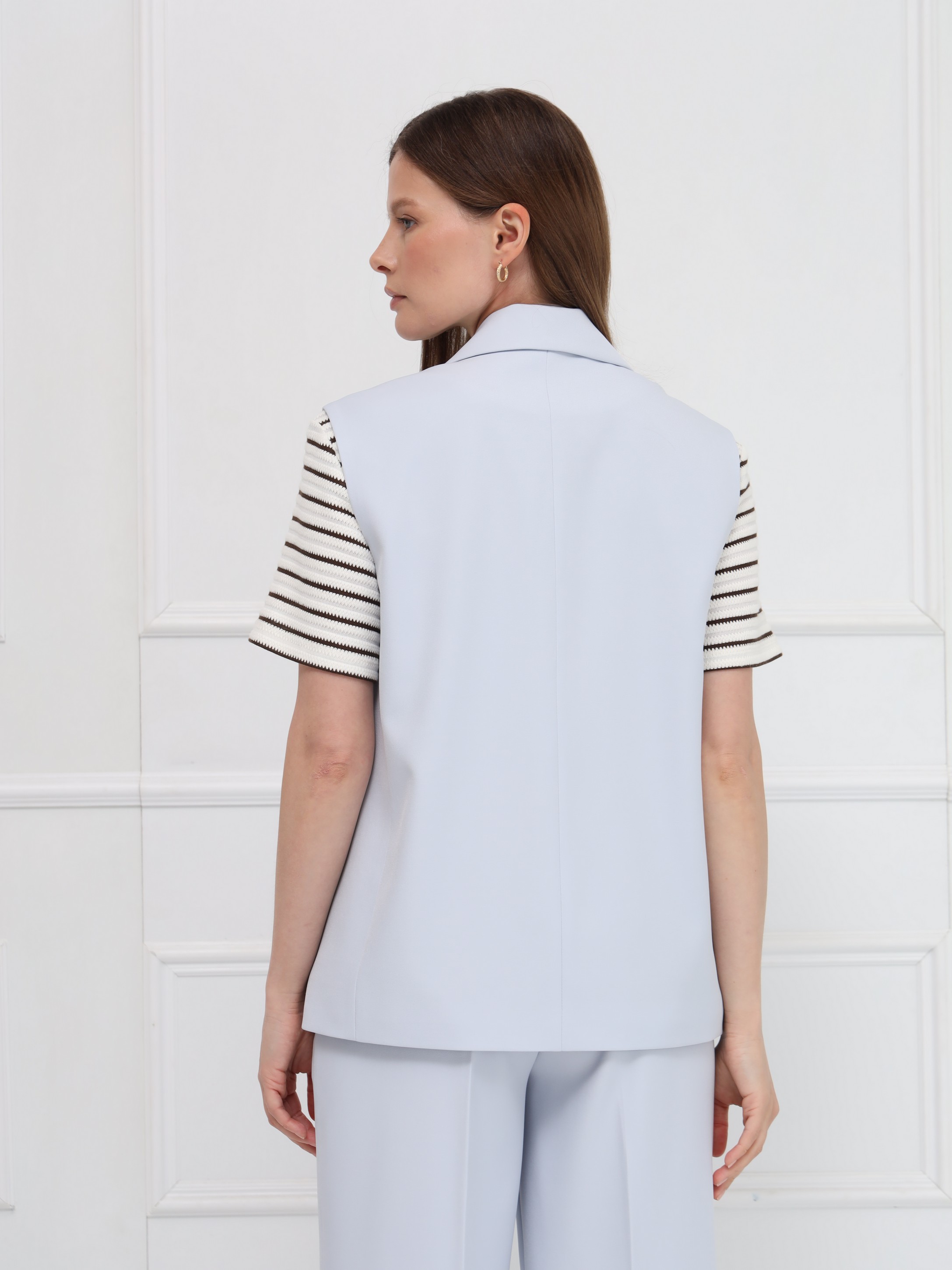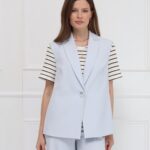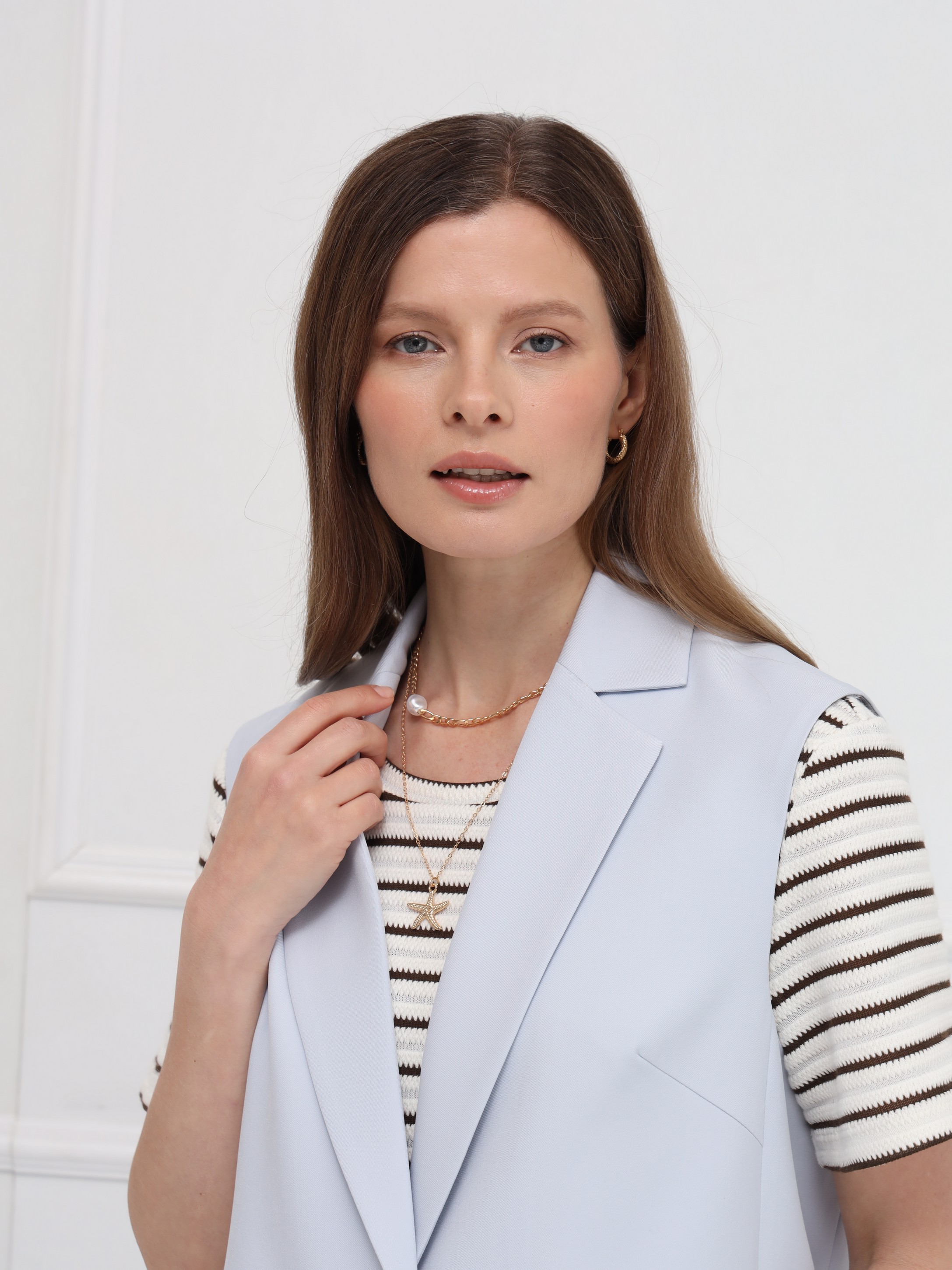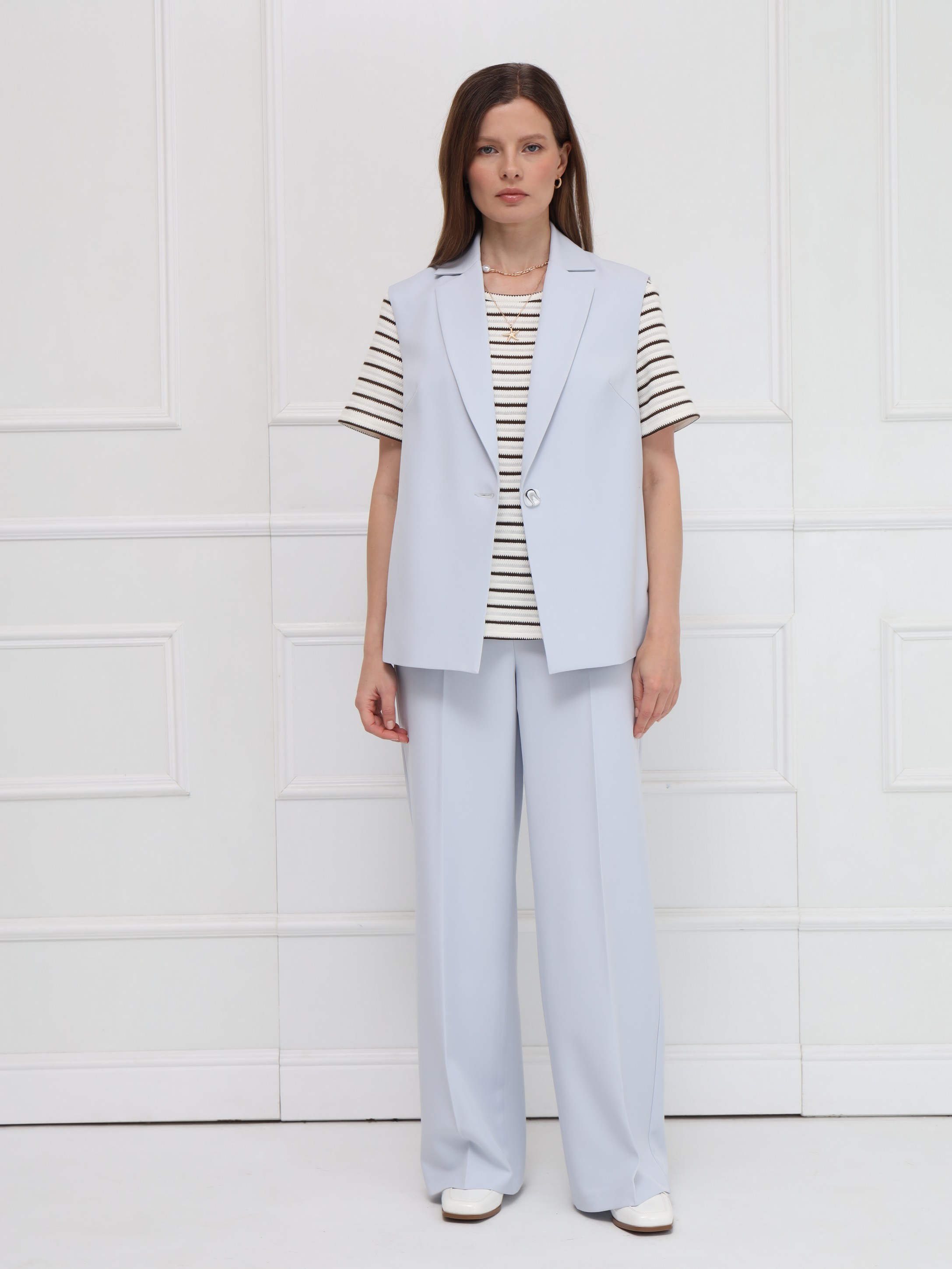 Жилет выполнен из тонкой костюмной ткани и станет лёгкой альтернативой жакету в летний сезон. Прямой крой и удлинённая линия плеча формируют современный силуэт, а английский воротник и застёжка на одну пуговицу придают модели структурность. Жилет полностью на подкладке, что обеспечивает аккуратную посадку и комфорт при носке. Вертикальные карманы, встроенные в рельефные швы, сохраняют чистоту линий и поддерживают минималистичную эстетику. Лаконичная модель делает образ выразительным без лишних деталей. Рекомендуем носить жилет поверх джемперов или блуз с коротким рукавом - он легко дополняет разные комплекты и добавляет им завершённости. На фото жилет представлен с брюками Б-2047 ПДВ(В6) и джемпером С-65 СМН(В6).