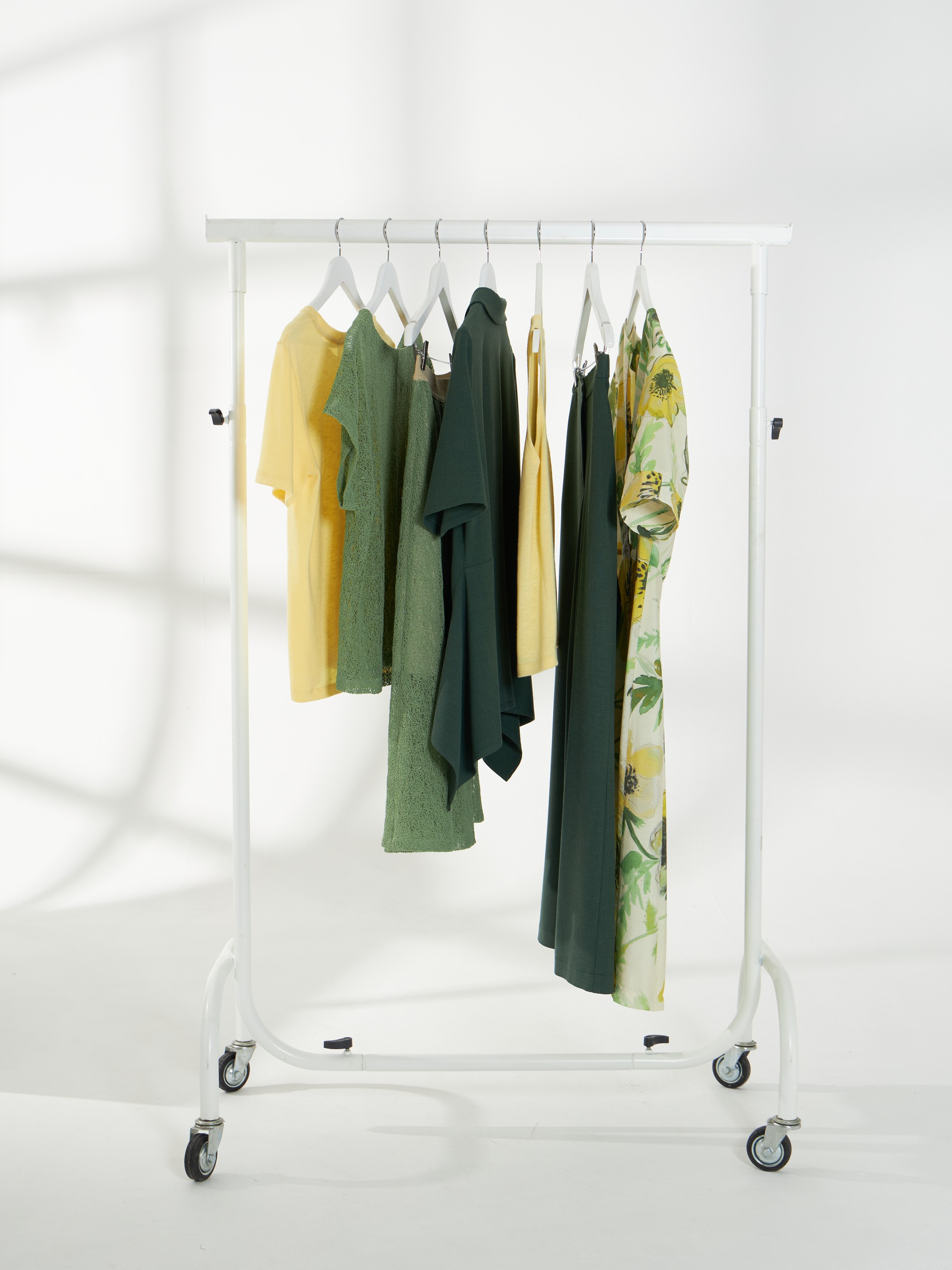 Свежий зелёный костюм формирует современный, аккуратный силуэт и дарит ощущение лёгкости в каждом движении. Яркий жёлтый топ и джемпер добавляют образу солнечного сияния и подчёркивают естественную красоту. Платье с крупным цветочным принтом звучит особенно женственно, как лето, которое хочется продлить.
